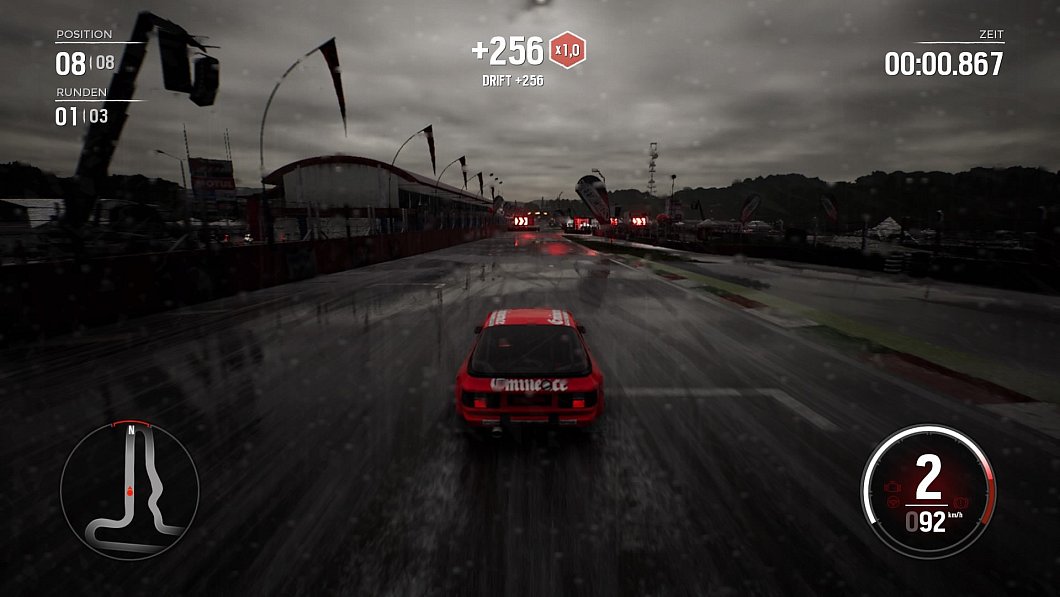 Das führt uns gleich nochmal zur KI der Gegner. Die fahren alle schön straight ihre Runden. Kommt man ihnen ins Gehege, zieht man meist den Kürzeren. Kommen die dem Spieler selbst in die Quere, scheint die Auswirkung dagegen nicht so krass zu sein. Womit wir beim Thema Kollisionsabfrage wären. Die widerspricht arcadetypisch geltenden physikalischen Gesetzen. Wenn wir also mit der rechten Seite uninspiriert in eine Leitplanke geraten, wirbelt die Kollision das Auto um die eigene Achse, wie man es selten schöner gesehen hat. Die Fahrphysik selber ist richtig arcadelastig, wem das zuwider ist, der kann in den Einstellungen immerhin die Fahrhilfen ausstellen, um ein wenig mehr Simulation auf die Strecke zu bringen.