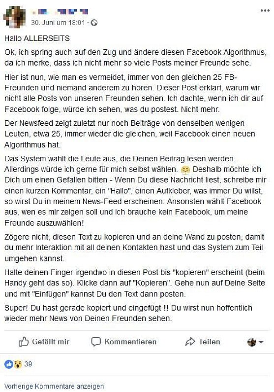"Ok, ich spring auf den Zug ... Kämpf gegen diesen Facebook Algorithmus, weil ich merke, dass ich nicht mehr so viele Posts meiner Freunde sehe." So beginnt ein Facebook-Post, der in diesen Tagen wieder vermehrt grassiert. Freunde posten ihn, weil sie glauben, feststellen zu können, dass sie immer nur die Beiträge von wenigen Freunden sehen, nicht aber die aller Freunde.