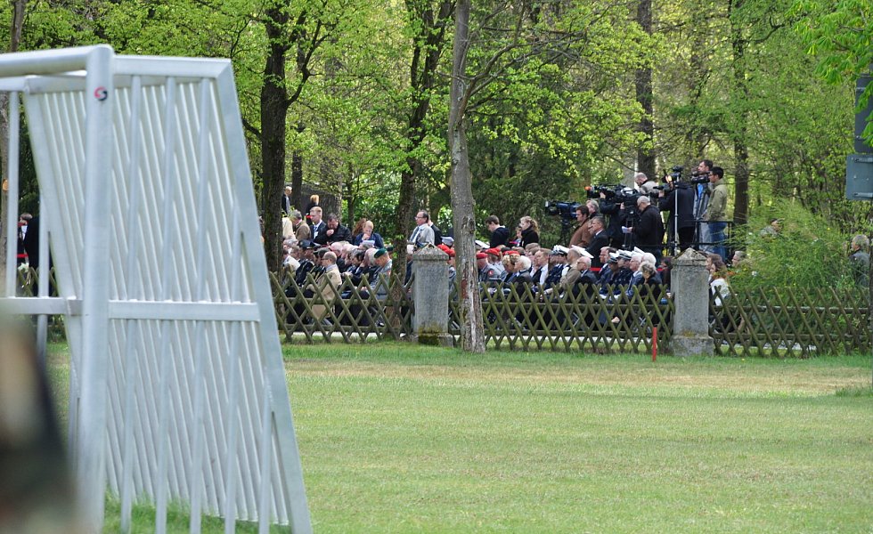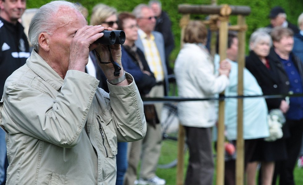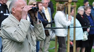 Nah heran geholt: Dieser Herr verfolgt das Geschehen auf dem Soldatenfriedhof mit dem Fernglas.