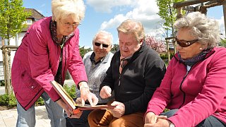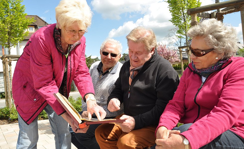 Erinnerungen: Rita Wölke (l.) zeigt Bärbel und Jürgen Biere sowie einem weiteren Herrn (v.r.) ihr Gästebuch, in das im Jahr 1989 schon Raissa Gorbatschowa geschrieben hat. Fotos: Karin Prignitz