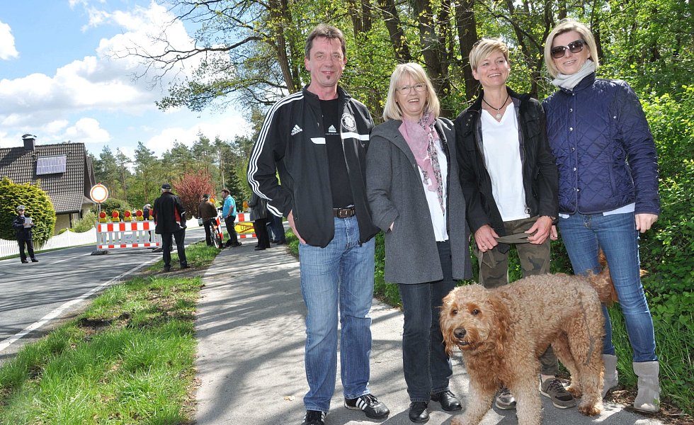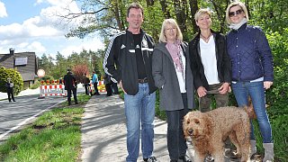 Wollen einen Blick erhaschen: Jürgen Engelns, Marita und Katja Austermeier sowie Sandra Cosack und Mischlingshund Lui warten gespannt auf die Ankunft von Joachim Gauck.