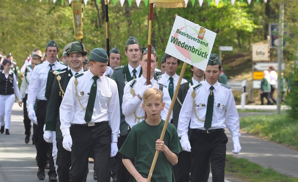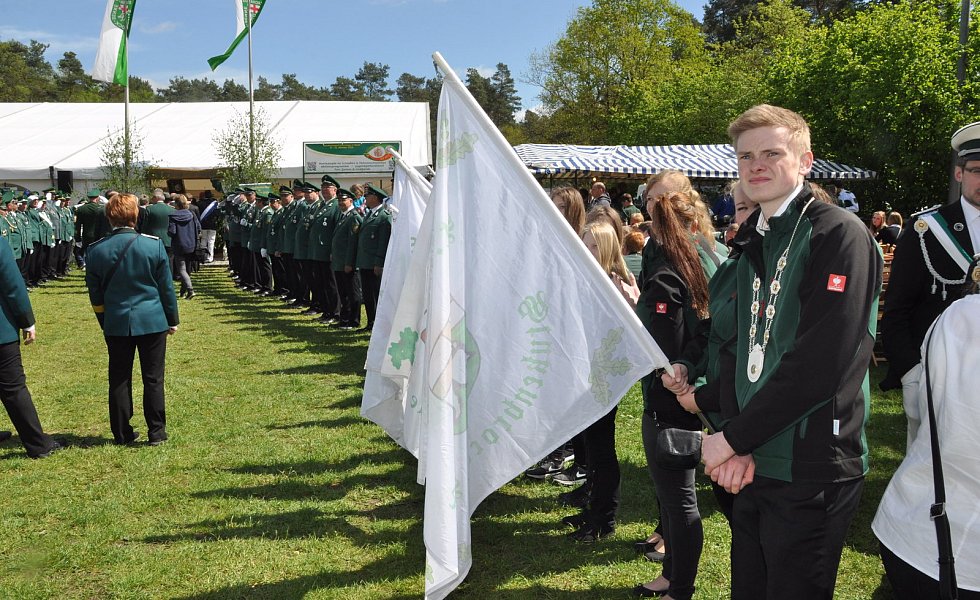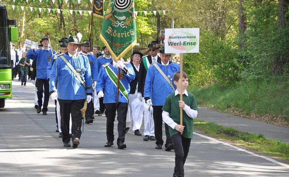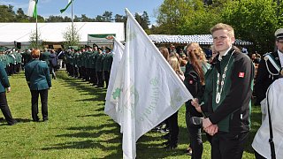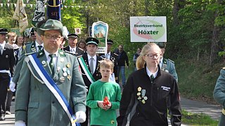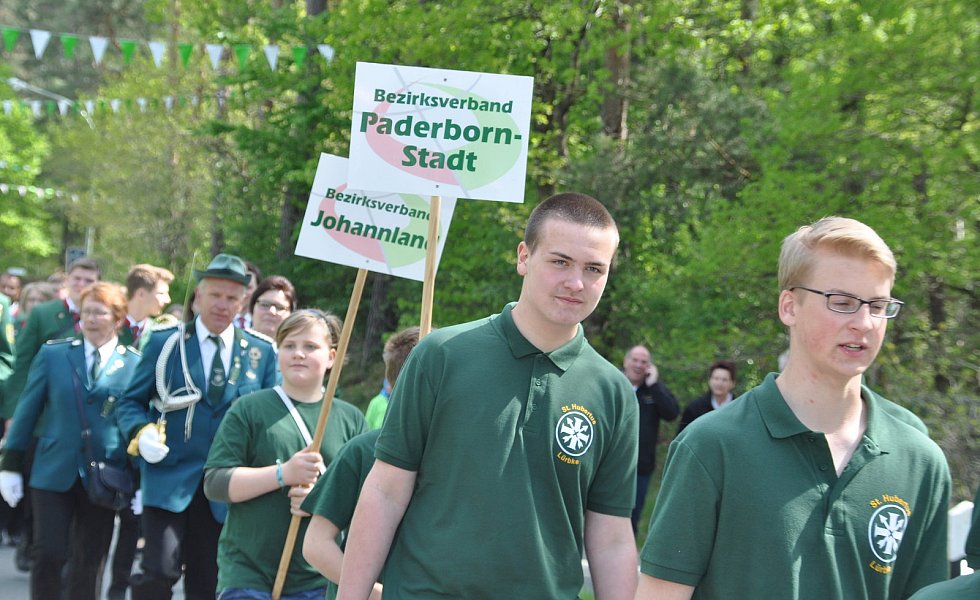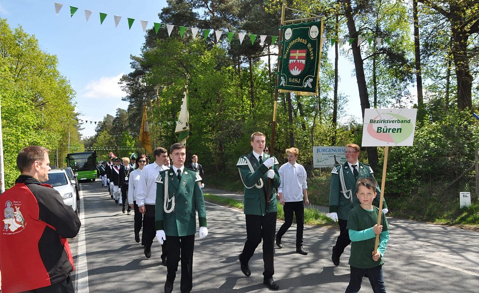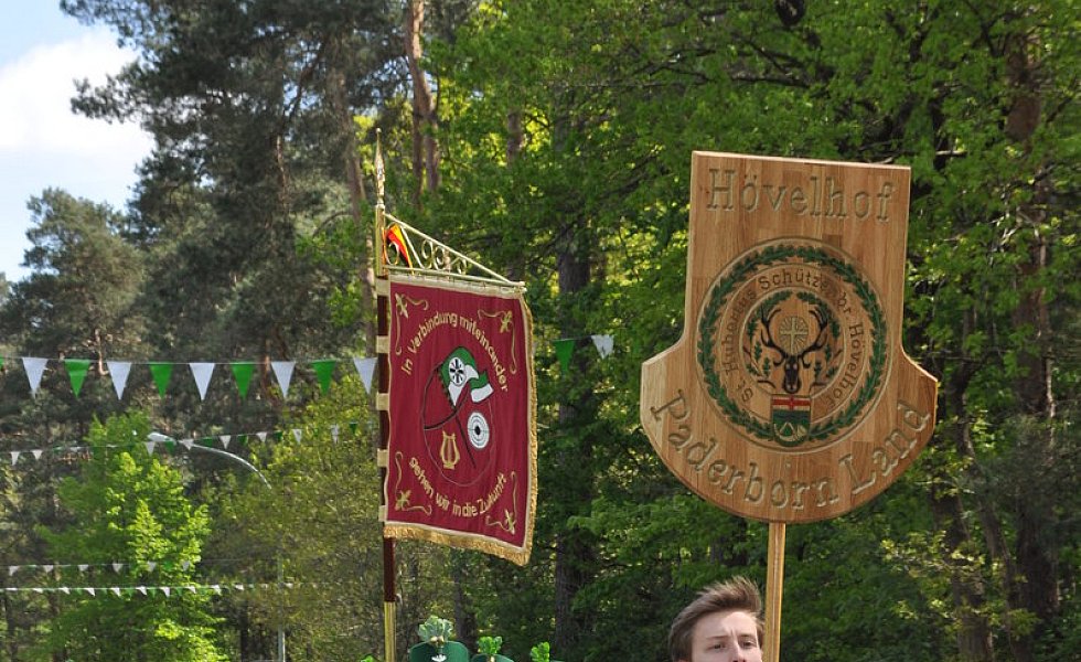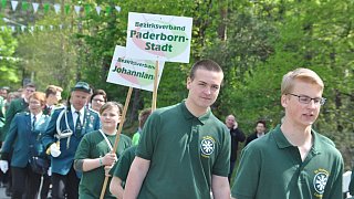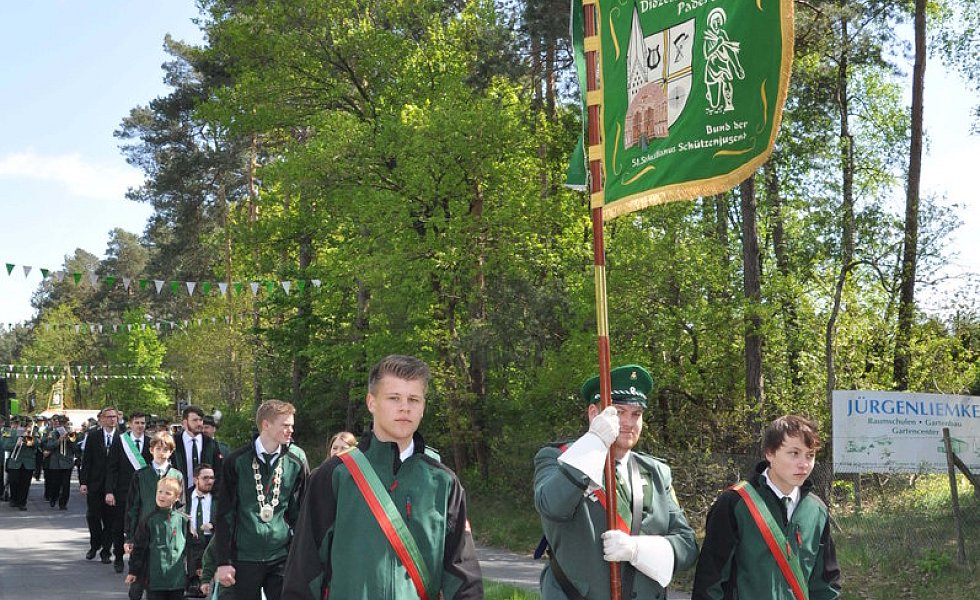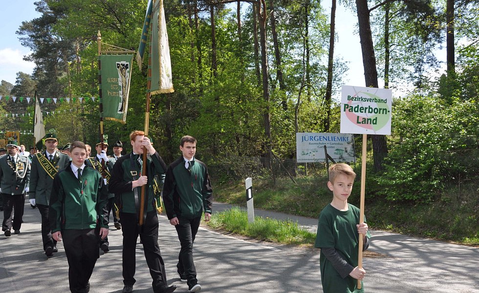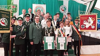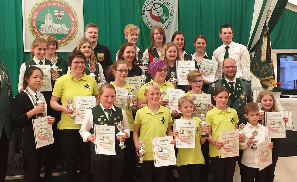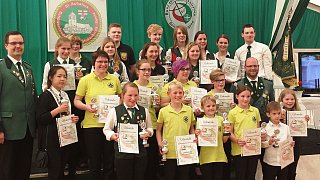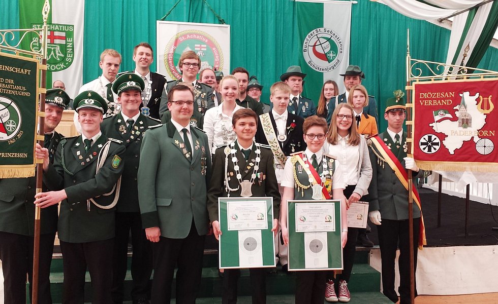Die Majestäten: Marvin Weigel von der Bruderschaft St. Georg Dreiländereck aus Verl-Sürenheide ist der neue Diözesanjungschützenprinz. Eileen Schäfergockel von der Bruderschaft St. Hubertus Elsen ist die neuen Diözesanschülerprinzessin. Hendrik Hillebrand (vorne l. neben dem Prinz) ehrt die beiden. Hinter ihnen stehen die Platzierten.