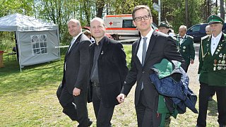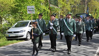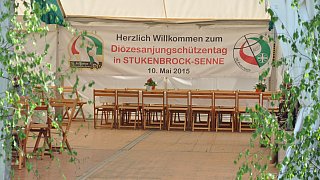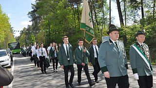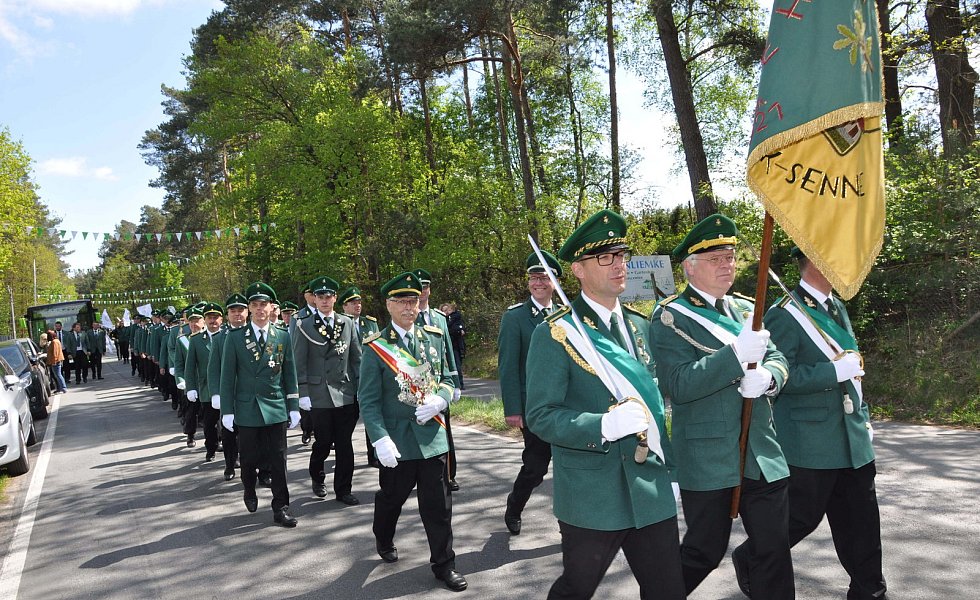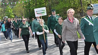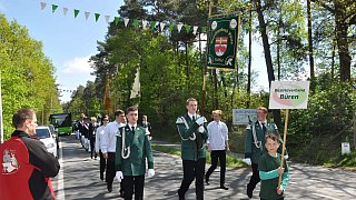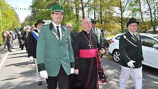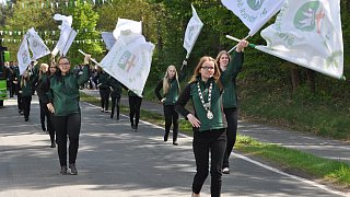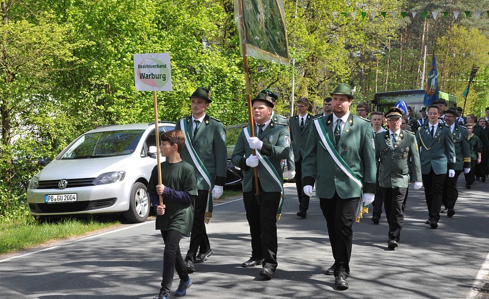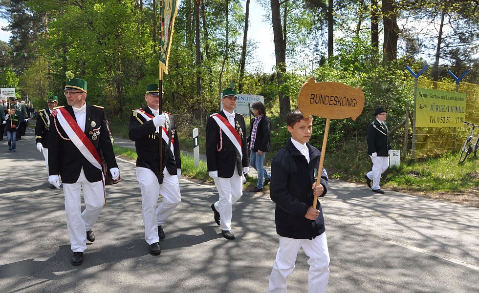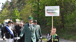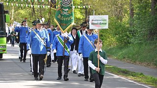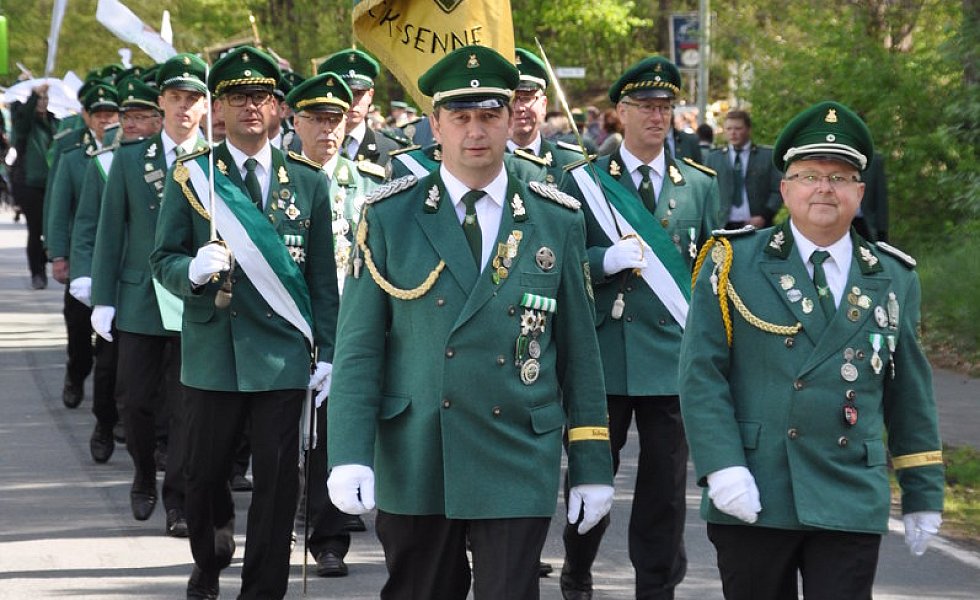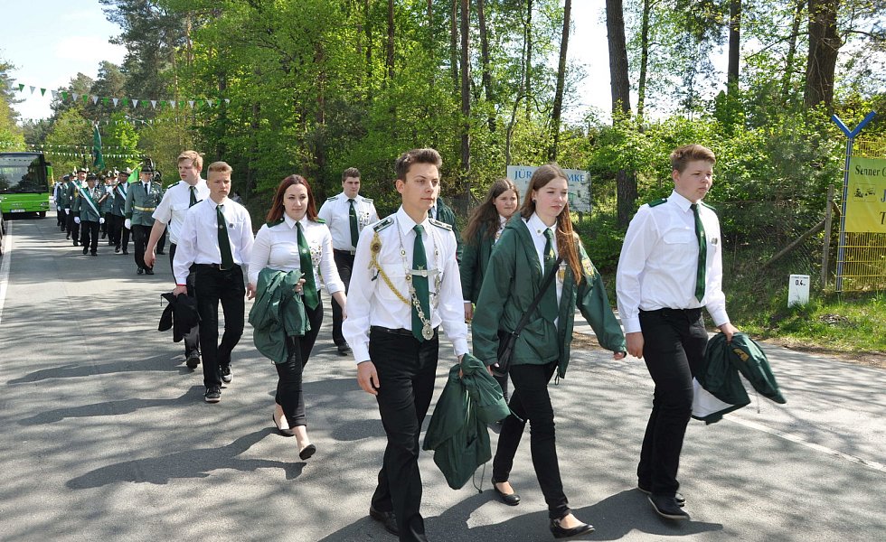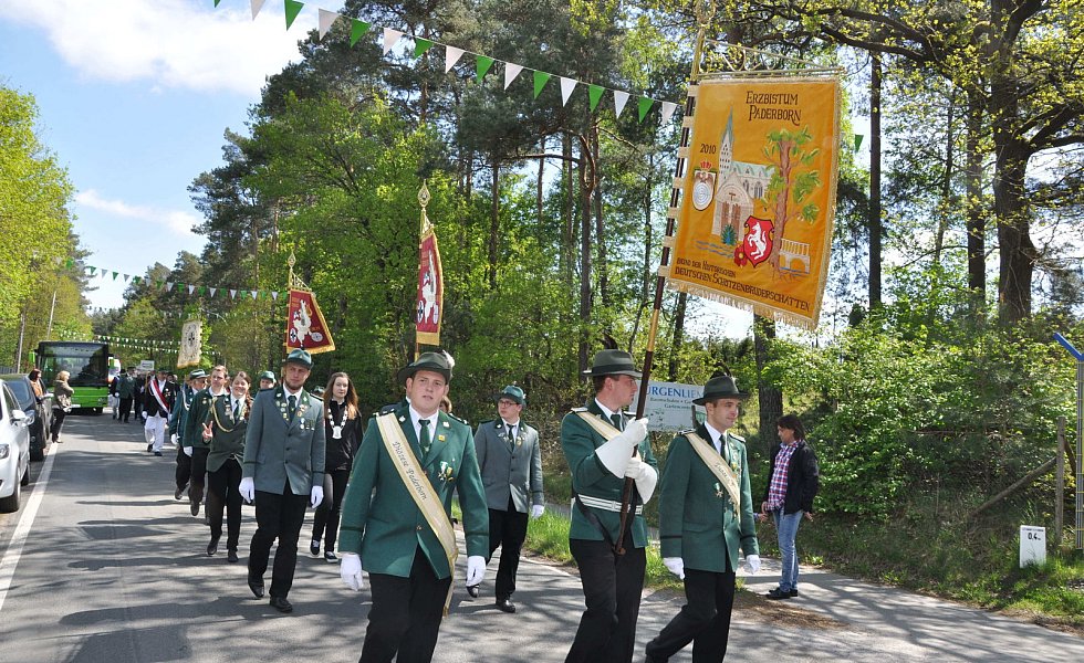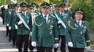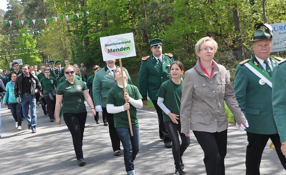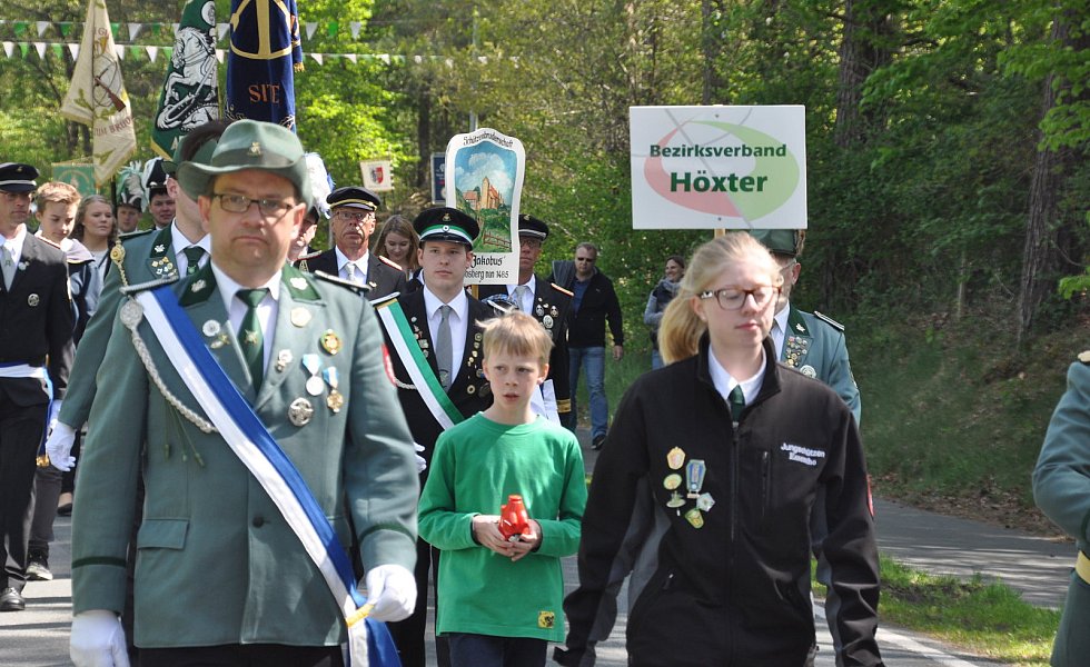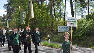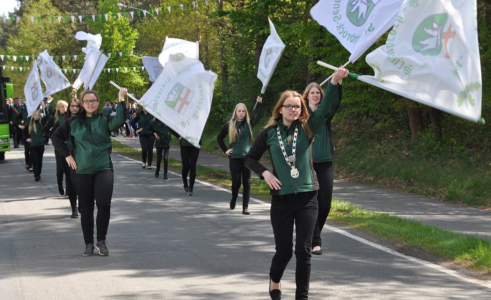 Die Majestäten: Marvin Weigel von der Bruderschaft St. Georg Dreiländereck aus Verl-Sürenheide ist der neue Diözesanjungschützenprinz. Eileen Schäfergockel von der Bruderschaft St. Hubertus Elsen ist die neuen Diözesanschülerprinzessin. Hendrik Hillebrand (vorne l. neben dem Prinz) ehrt die beiden. Hinter ihnen stehen die Platzierten.