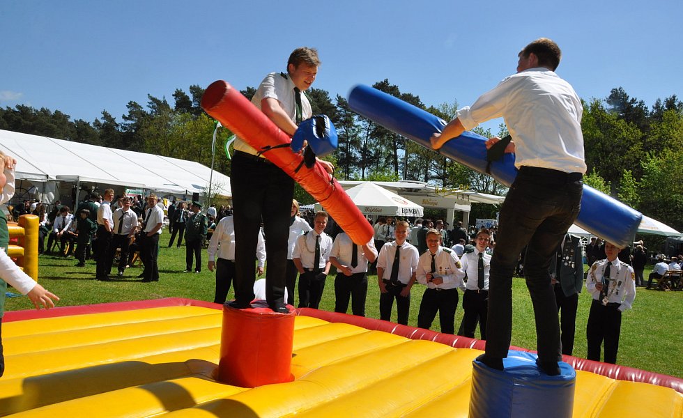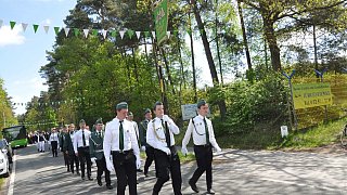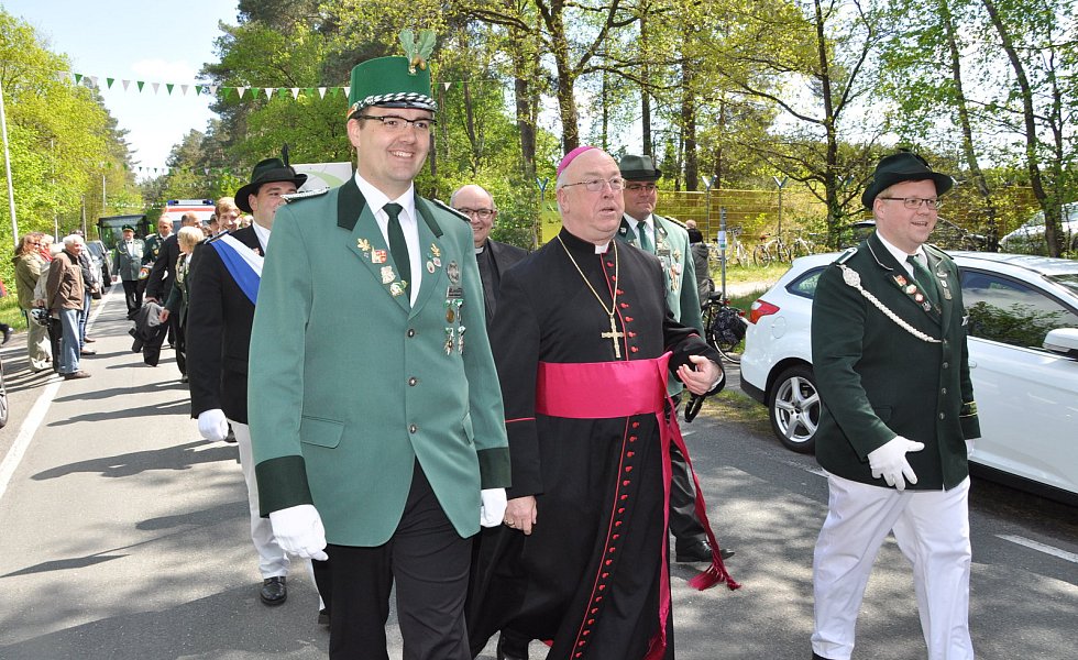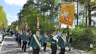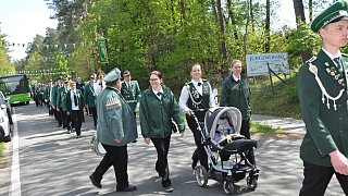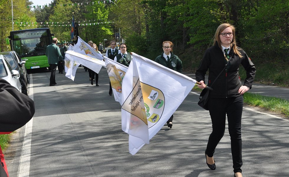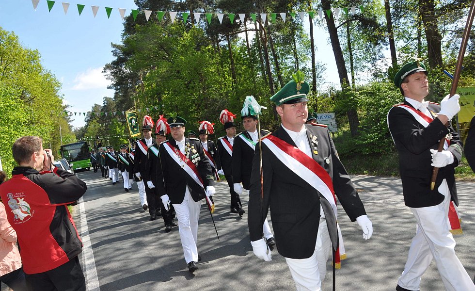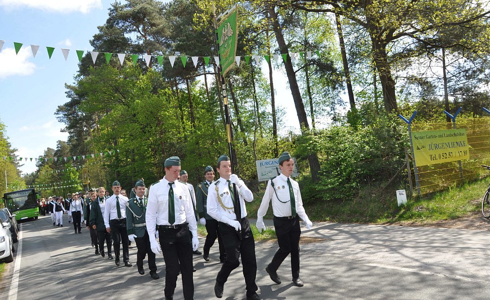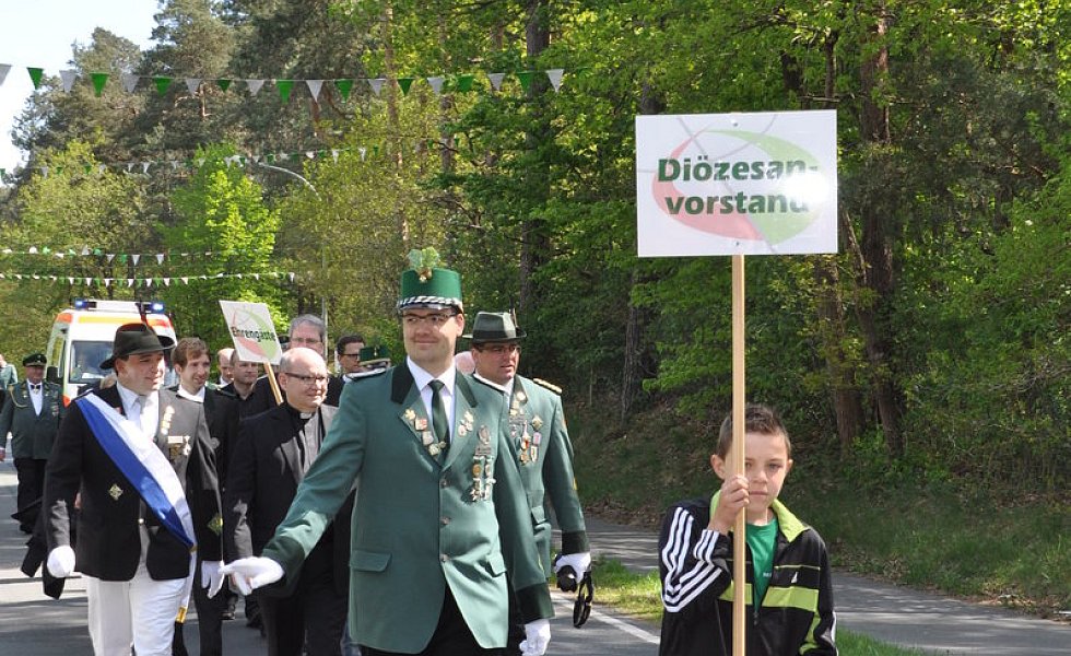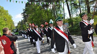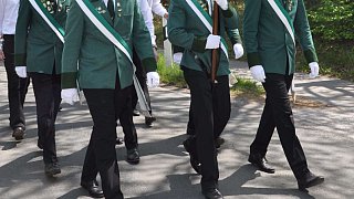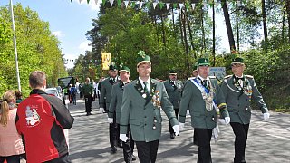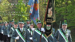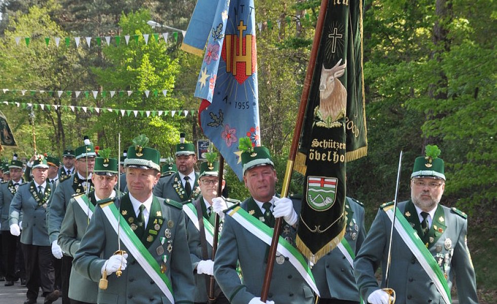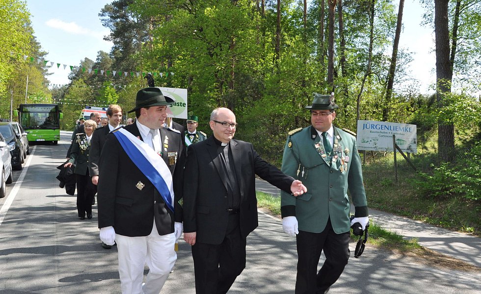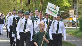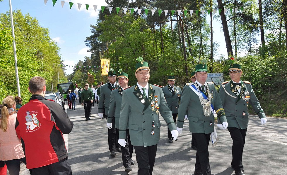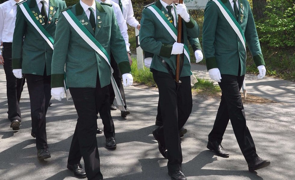 Die Majestäten: Marvin Weigel von der Bruderschaft St. Georg Dreiländereck aus Verl-Sürenheide ist der neue Diözesanjungschützenprinz. Eileen Schäfergockel von der Bruderschaft St. Hubertus Elsen ist die neuen Diözesanschülerprinzessin. Hendrik Hillebrand (vorne l. neben dem Prinz) ehrt die beiden. Hinter ihnen stehen die Platzierten.