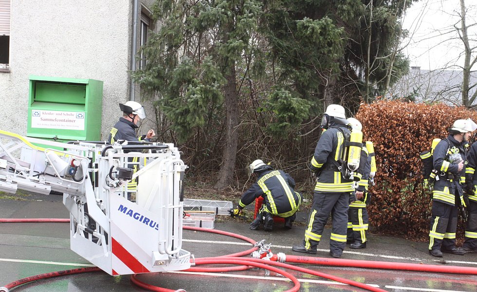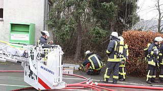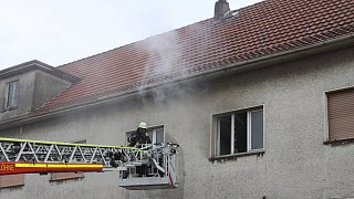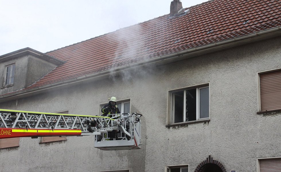 Mithilfe der Drehleiter erreichten die Feuerwehrleute das 1. Obergeschoss des Hauses, das stark verraucht war. Foto: Susanne Barth