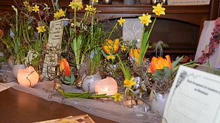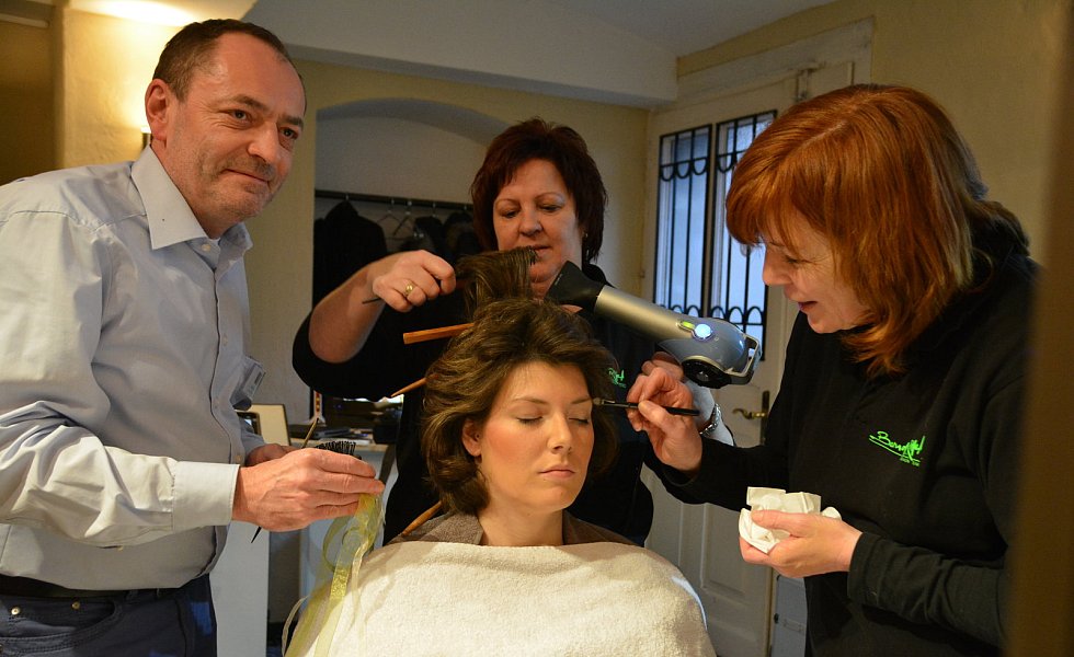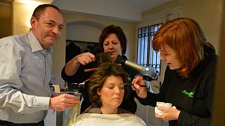Wilder Look: Bernd Ritter (v.l.), Silvia Niemeier und Sabine Scheiding stylten Sonja Hugel im Keller der Villa Meyer. "Natürlichkeit ist momentan angesagt, sowohl bei der Frisur als auch beim Make-Up", meinte Friseurmeister Bernd Ritter. Foto: Christina Nahrwold