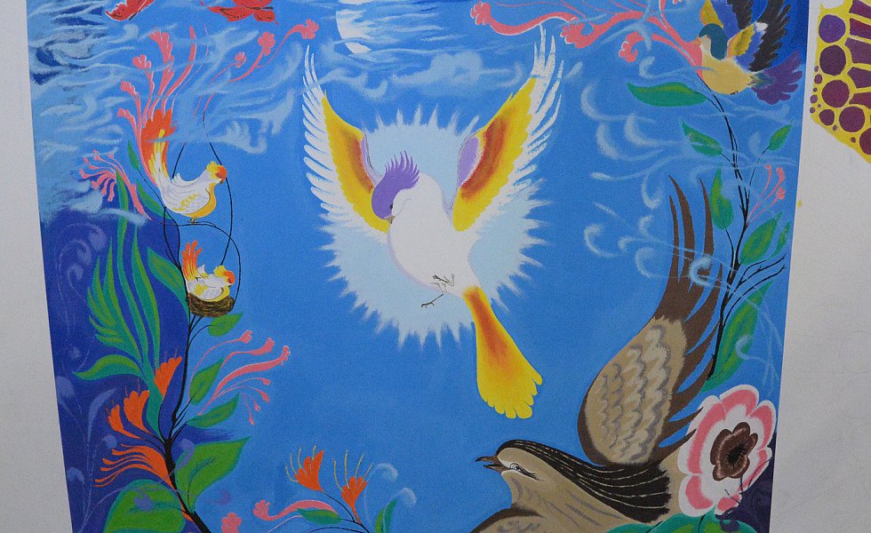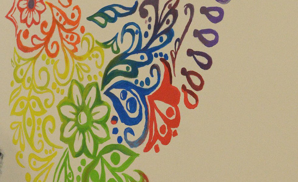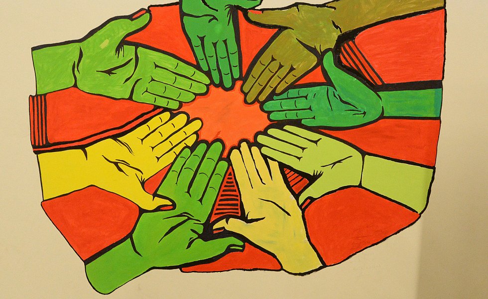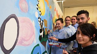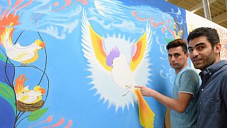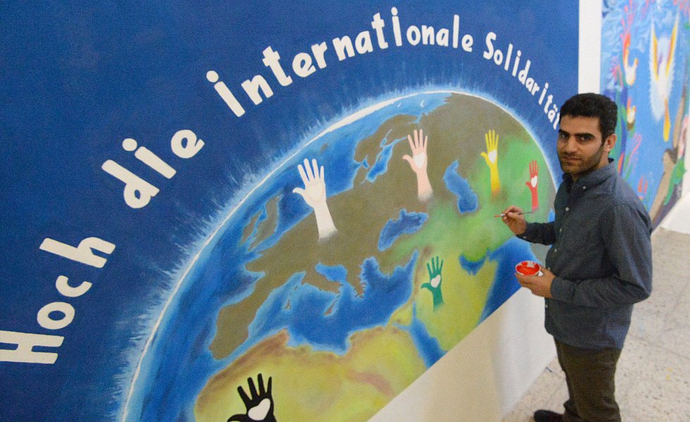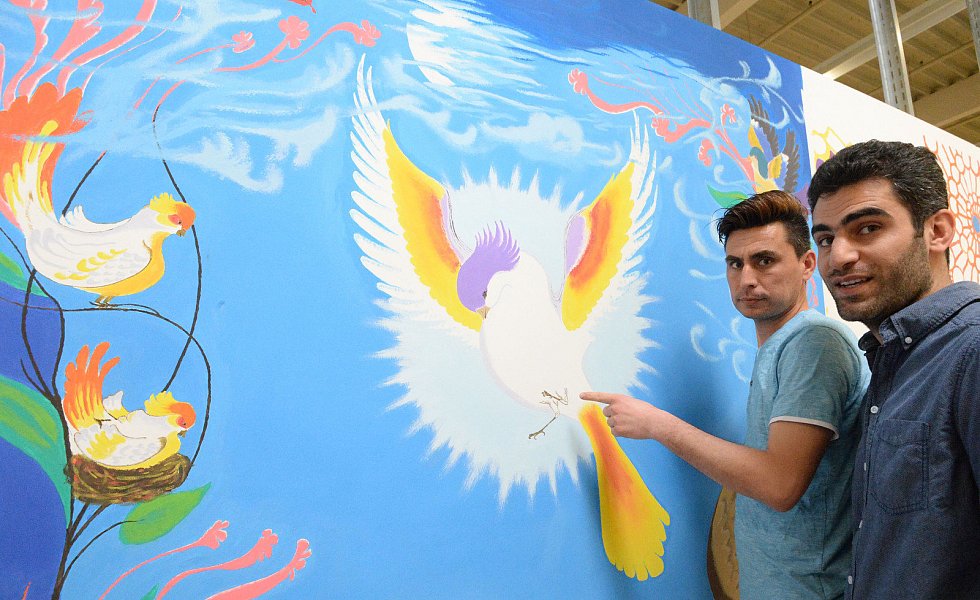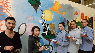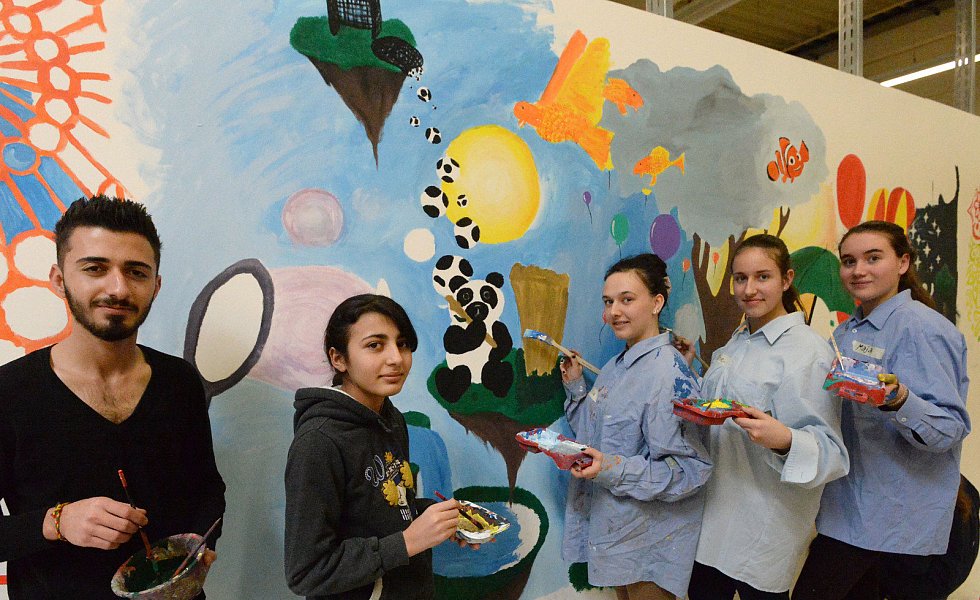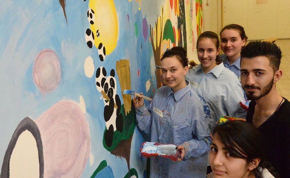 Mit bunten Farben bemalten Flüchtlinge und Schüler zusammen freigegebene Wände in der Unterkunft
