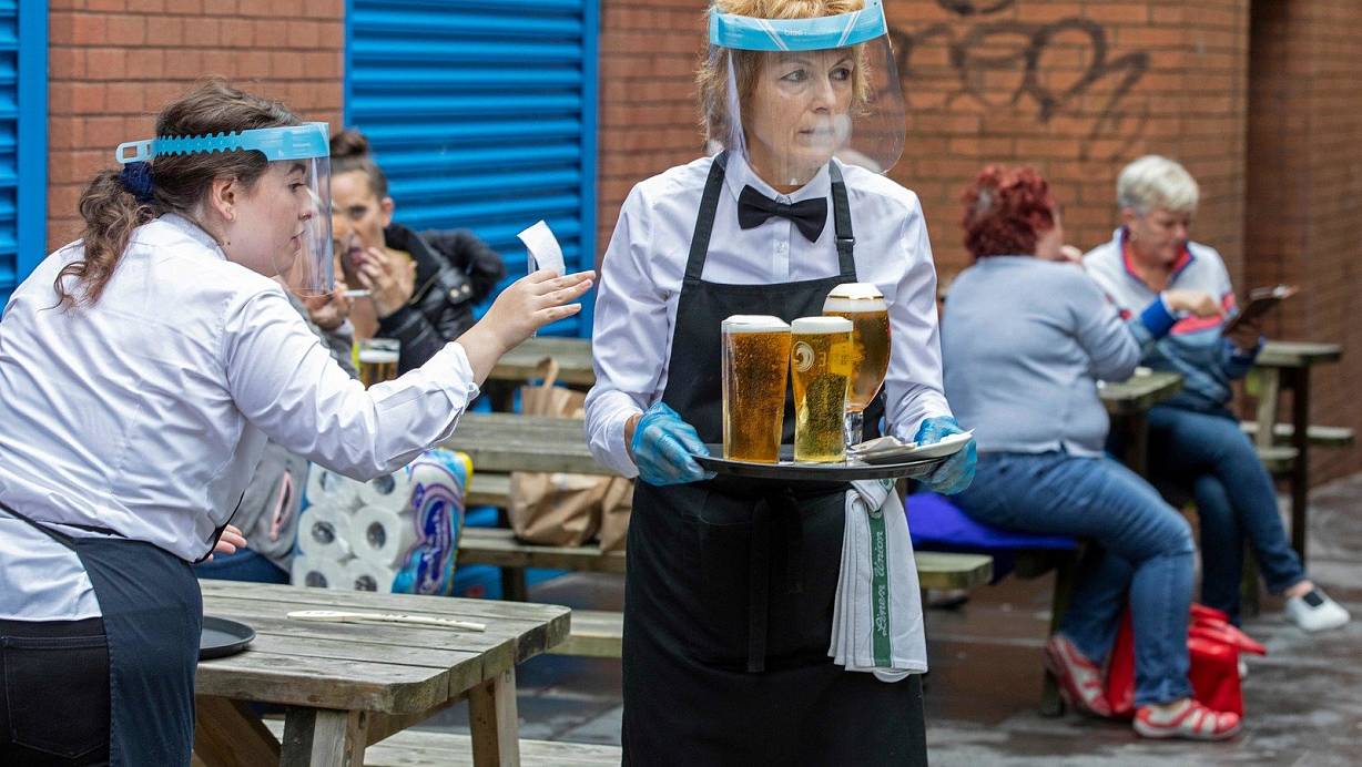 Eine Kellnerin trägt während der Arbeit ein Visier, um sich vor einer Ansteckung mit dem Coronavirus zu schützen. In der Schweiz warnen Behörden vor dem alleinigen Tragen von Visieren. Sie raten zu Mund-Nase-Bedeckungen. | © AFP