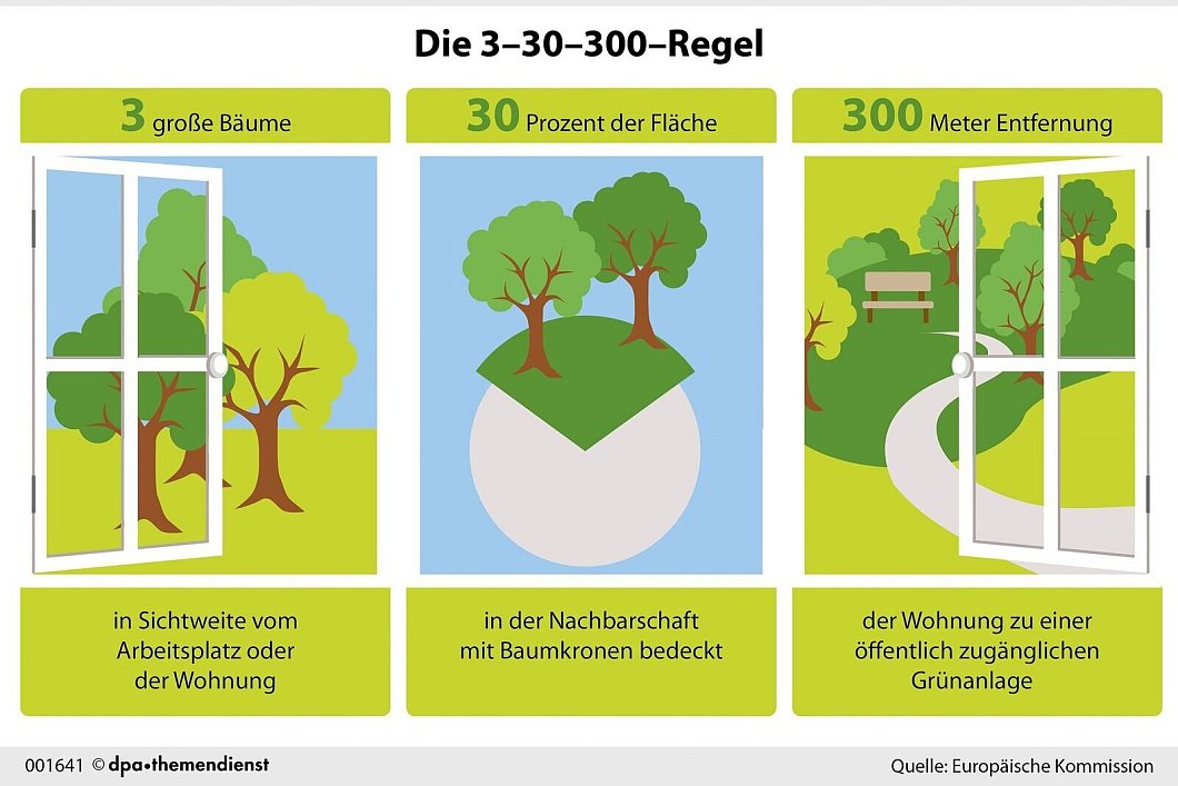 Darauf zahlt auch die sogenannte 3-30-300-Regel ein, die vor einigen Jahren vom niederländischen Forstwissenschaftler Cecil Konijnendijk für die Städteplanung formuliert wurde: