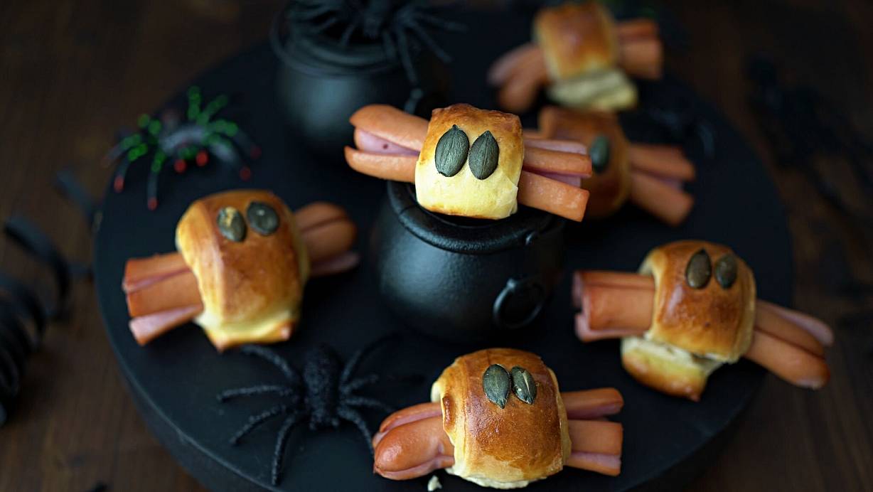 - Jede Würstchenspinne mit zwei Kürbiskernen belegen.