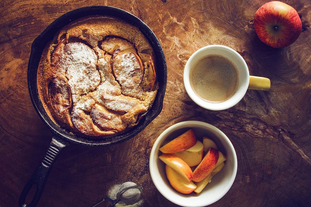Luftige Leckerei aus dem Backofen: Für den Pancake wird der Teig über die Apfelscheiben gegossen und in der Röhre gebacken. Mehr Süße ist nicht drin, kann aber später durch Ahornsirup oder Puderzucker ergänzt werden. - © Aileen Kapitza/minzgruen.com/dpa-tmn