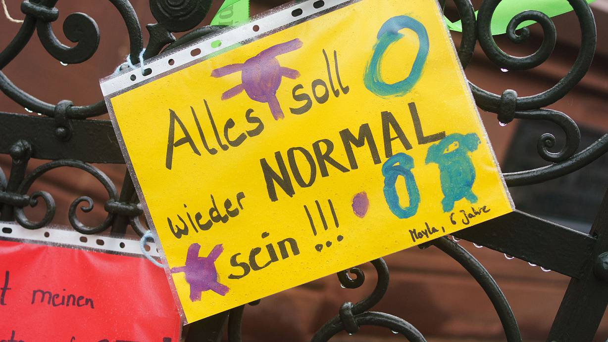 "Alles soll wieder normal sein" steht als Wunsch auf einem Bild am Zaun eines Kindergartens. | © picture alliance/dpa