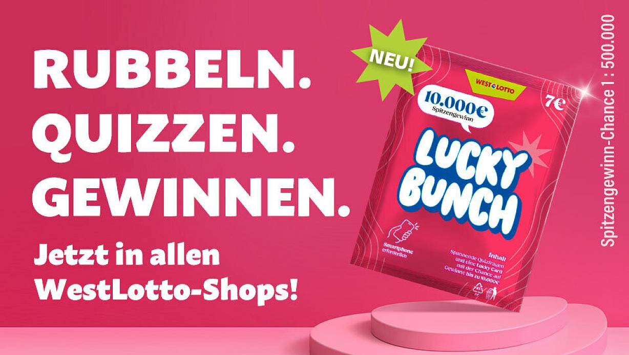 Wie heißt die Stadt, in der die Tatort-Kommissare Boerne und Thiel ermitteln? Was wurde 1914 auf der Burg Altena eröffnet? Und welcher Flughafen des Bundeslandes diente einst als Landebahn für das Space Shuttle? Solche Fragen sind ab sofort Teil eines völlig neuen Spielerlebnisses bei WestLotto. Das neue Rubbellos Lucky Bunch verbindet den klassischen Rubbelspaß mit unterhaltsamen Wissensfragen und sorgt damit für frischen Wind. Mit einem Mix aus Fun-Facts, lokalem NRW-Wissen, 90er-Jahre-Nostalgie und viel Humor spricht das innovative Konzept sowohl Rubbelfans als auch Ratefüchse an.