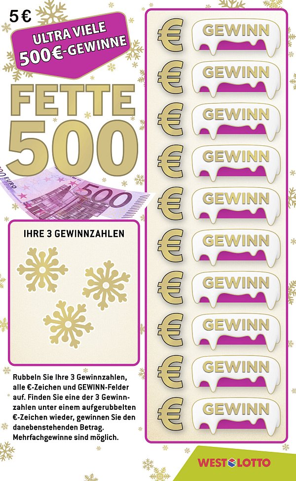 Inspiriert vom Weihnachtsklassiker „Leise rieselt der Schnee" greift zum Beispiel die Winteredition von Fette 500 mit ihrem Schneeflocken-Design die ruhigen, besinnlichen Momente der Adventszeit auf – und verbindet sie mit einem Hauch Spannung. Denn hinter dem winterlichen Look steckt die beste Chance auf einen 500-Euro-Gewinn bei allen WestLotto-Rubbellosen (Chance 1:1.000).