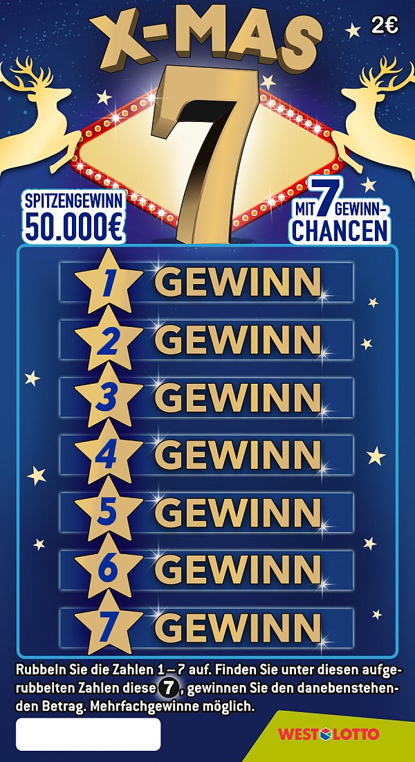 Rubbeln Sie die Felder 1-7 auf. Finden Sie hier eine 7 unter der Rubbelfläche, gewinnen Sie den danebenstehenden Betrag. Sieben Chancen auf einem Los, auch Mehrfachgewinne sind möglich.