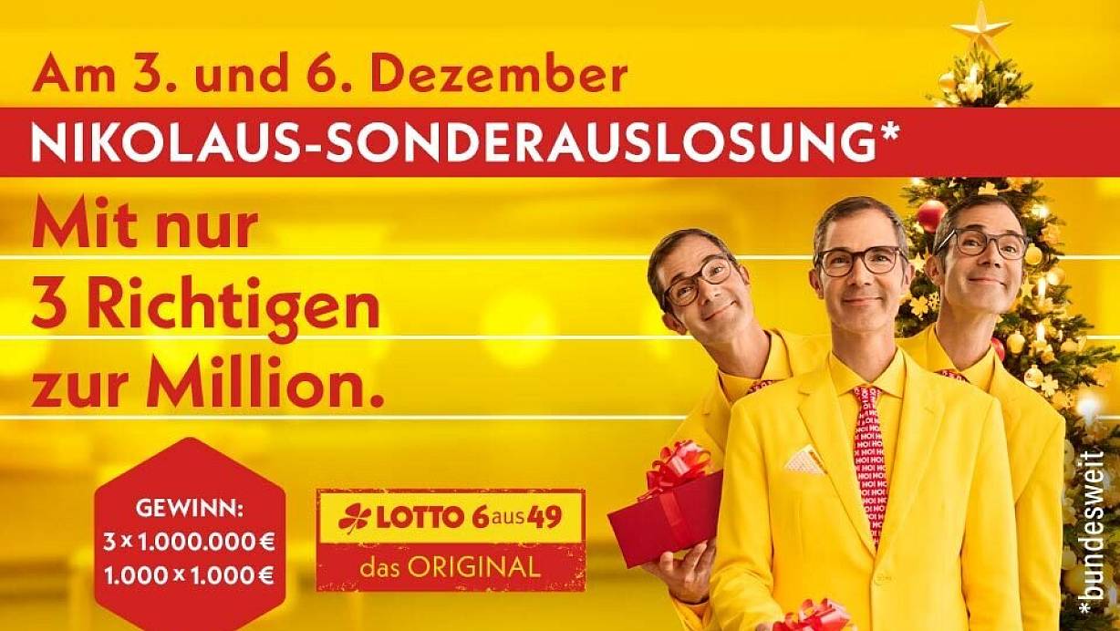 Bald ist Nikolaus. Und eine Spielquittung von LOTTO 6aus49 im Stiefel könnte für eine angenehme Überraschung sorgen: Denn in der bundesweiten Sonderauslosung bei LOTTO 6aus49 gibt es jede Menge Extra-Gewinne. Alle Spielaufträge, mit denen in den Ziehungen am Mittwoch (3. Dezember) und Samstag (6. Dezember) drei Richtige erzielt worden sind, nehmen automatisch daran teil.