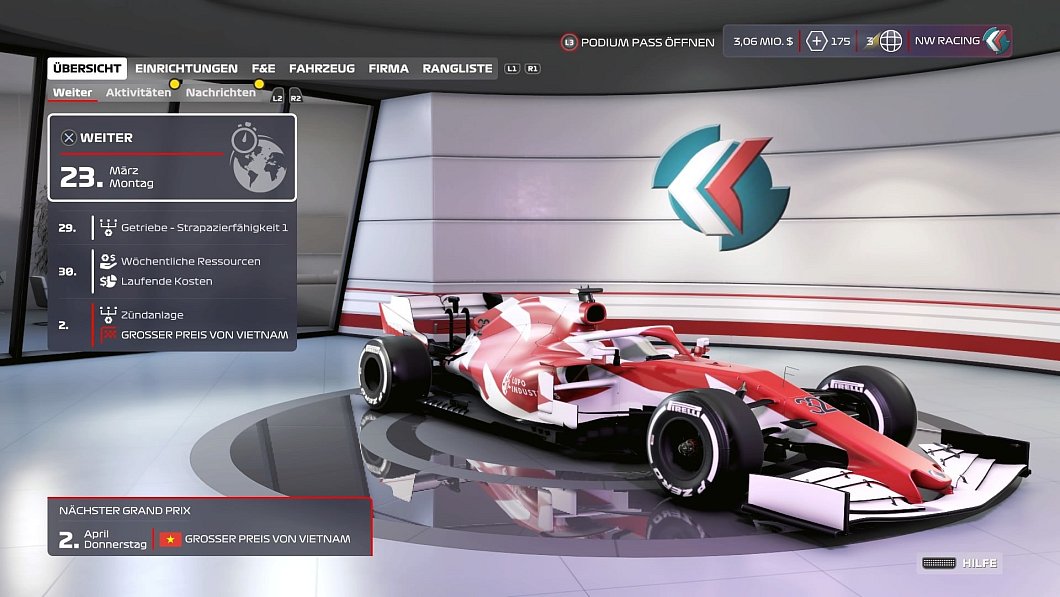 In die F1 aufgestiegen und damit im Hauptteil des Karrieremodus angekommen, entscheiden wir uns für eins der zehn offiziellen Teams und bestimmen ähnlich wie auch in der F2 über die Länge der Saison. Neben den Meisterschaftspunkten sammeln wir bei den verschiedenen Rennveranstaltungen sogenannte Ressourcenpunkte, die wir zur Verbesserung des Teams investieren können. Möglichkeiten dazu gibt es in den Bereichen Aerodynamik, Motor, Chassis (Fahrgestell) und Strapazierfähigkeit genügend.