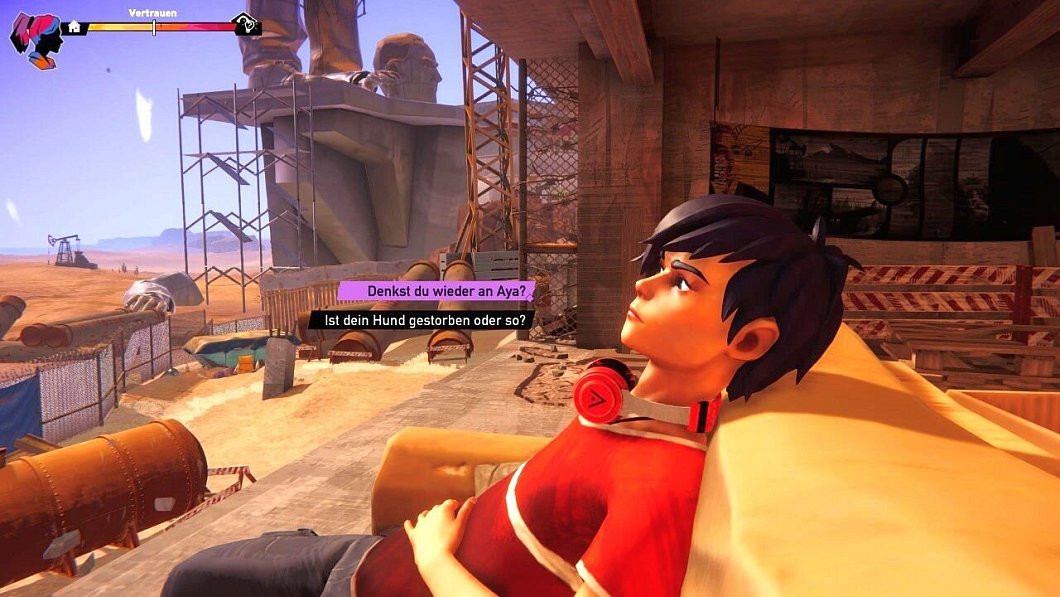 Zoe und Kaito sind Freunde. Wenn wir das Spiel beginnen, ist der Grundstein dafür schon gelegt: Sie haben sich in einem Rohbau eine Art Versteck gebaut mit einem Sofa, auf dem sie sitzen und über die Skyline von White Sands schauen. Aus dem Kassettenrekorder links neben dem Sofa schallt Musik, und wenn wir aufstehen, können wir an einem Arcade-Automaten eine Runde "Super Skate" spielen. Es erinnert ein wenig an die anfängliche Stimmung aus "Life is Strange".