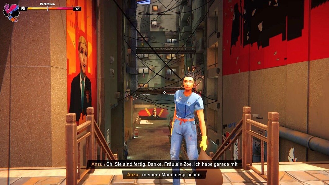 Das Spielerlebnis selbst fühlt sich anfangs etwas seicht an, wovon man sich aber nicht täuschen lassen sollte. Die bedrohliche Welt von Petria lernt auch Zoe nach und nach kennen. Natürlich lassen wir sie mal Plakate abreißen, wenn uns das Spiel die Gelegenheit dazu gibt. Tun wir das an gut einsehbaren Plätzen, klickt eine Überwachungskamera, und uns ist klar: Das könnte Folgen haben. Zoes Zweifel wachsen, dass dieses Land vielleicht doch nicht so ist, wie ihr Vater es immer darstellt. Also lassen wir sie jetzt auch mal Mülleimer durchsuchen, weil das Spiel uns die Möglichkeit bietet, und wir ja alles auskosten wollen. Prompt fragt eine Stimme hinter uns, ob Zoes Vater ihr nichts zu essen gebe. Wir sind einfach immer unter Beobachtung.