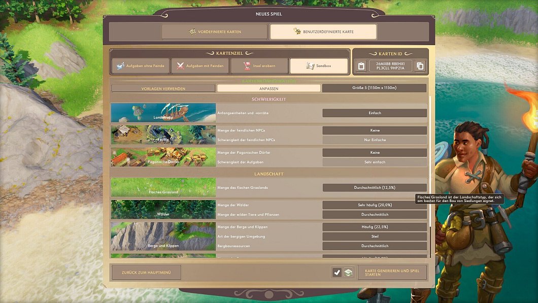 Wem das etwas zu komplex ist, der kann auch ganz alleine auf einer Insel siedeln. Derzeit stehen mehrere Karten zur Verfügung, deren Voreinstellungen sich aber individuell ändern lassen. Damit lassen sich Karten ganz nach dem persönlichen Geschmack entwerfen.