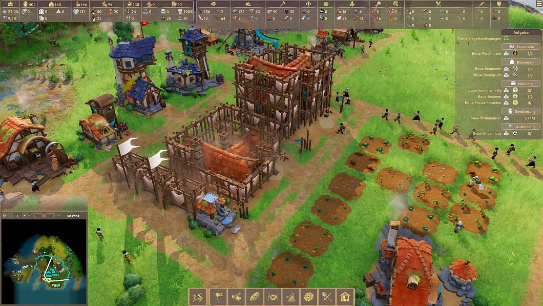 Recht schnell wird deutlich, dass „Pioneers of Pagonia“ die Erfolgsformel der „Siedler“-Reihe anwendet. Wir starten mit einem Schiff voller Ressourcen und Waren sowie einigen Untertanen. Sogleich fangen wir an, die vor uns liegende Insel zu bebauen. Wir legen Straßen an, bauen Holzfällerhütten und Steinbrüche, um Ressourcen für den weiteren Ausbau zu sammeln. Mit Wachtürmen erweitern wir nach und nach unseren Einflussbereich; Sammler- und Jagdhütten, Gemüse- und Getreidefarmen sorgen für die Nahrungsversorgung unserer Pioniere.