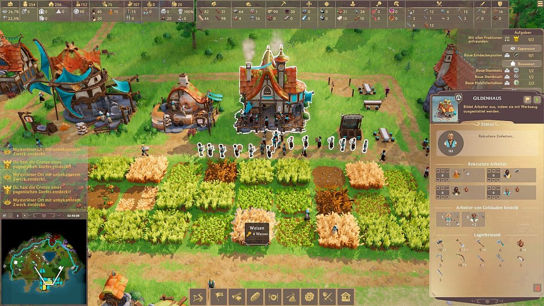Denn die Ressourcen auf den prozedural generierten Inseln in „Pioneers of Pagonia“ sind endlich. Zwar können Wälder von einem Förster neu gepflanzt werden, aber Vorkommen an Kohle, Kalkstein oder Eisen sind irgendwann erschöpft. Das zwingt uns fast schon dazu, unseren Einflussbereich immer weiter zu vergrößern und neue Quellen zu erschließen. Oder wir handeln mit uns freundlich gesinnten Dörfern oder beliefern neutrale Gebäude, die über die Karte verstreut sind.