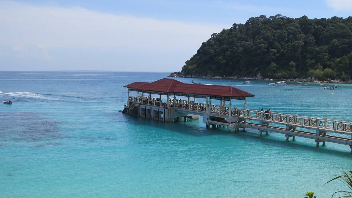 Mit einem wirklichen kleinen Kutter muss man aus dem Küstenort Besut zur Insel hinüberfahren. Bei gut 20 Menschen und wenig Platz wirkt das wie ein Abenteuer für sich. Auf den schmalen Bänken sitzt man eng gedrängt wie früher im Sportunterricht. Das Gepäck wird vorne ins Boot gelegt – die gut 20 Personen in diesem Mini-Kutter sind das absolute Maximum, das er vertragen kann. Wer doch ein mulmiges Gefühl im Magen hat, der blickt von seinem engen Plätzchen aus zur Ablenkung ins durchgehend türkisblaue Wasser. Dabei ist die Skepsis völlig überflüssig.