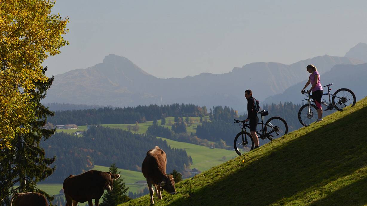 Wenn sich morgens der Bodensee noch unter einer dichten Nebeldecke versteckt, lacht nur wenige Kilometer entfernt die Sonne. Mehrere Straßen führen ins Westallgäu – eine wunderschöne Hochebene. Dort reicht der Blick bis zu den Zweitausendern Kanisfluh und Mittagsspitze im Süden. Die noch recht ruhige Urlaubsregion mit seinen kleinen Gemeinden im südwestlichen Zipfel Bayerns punktet durch Naturverbundenheit, Ruhe und sonnenreiche Tage.