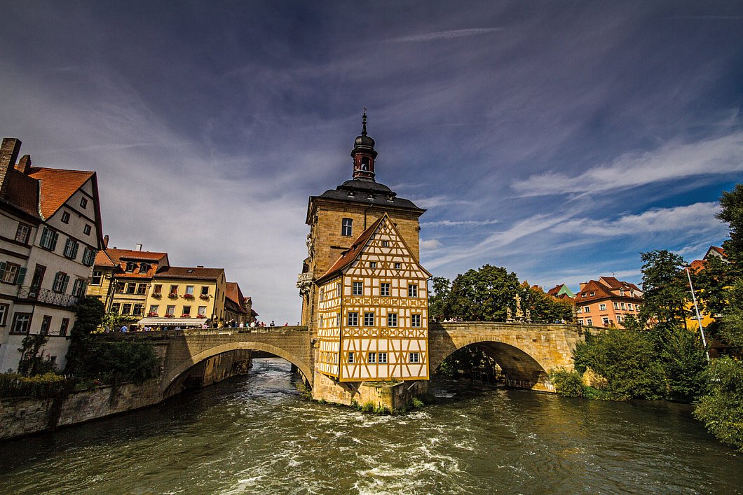 In Bamberg sollte man Aecht Schlenkerla Rauchbier probieren, dazu ein paar Würstel im Brötla. So heißen hier die Brötchen. Nur ein kleiner Vorgeschmack auf die deftige fränkische Küche. Ein Streifzug durch die von Fachwerkgebäuden geprägte Stadt führt zum Alten Rathaus auf der Regnitz- insel und natürlich hinauf zum Dom mit dem Bamberger Reiter, jenem Sandstein-Standbild aus dem frühen 13. Jahrhundert, das zum Wahrzeichen der Stadt avancierte.
