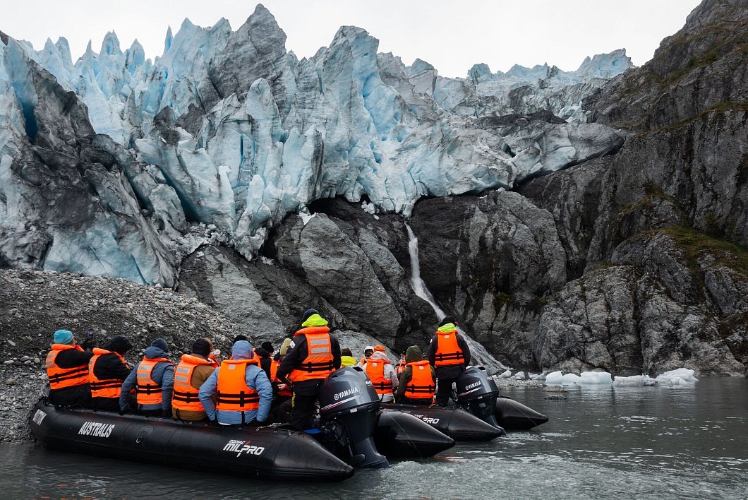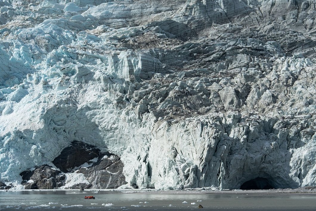 Im tiefsten Teil des Fjords versteckt sich der Gletscher Porter. Abermals geht es in die Beiboote. Sie manövrieren durch ein Eissplittermeer. Im Wasser treiben fragile Kristallfiguren: Sie erinnern an Enten, Schwäne, Rehköpfe. Die Fantasie läuft beim Anblick vielgestaltigen Schollen auf Hochtouren. Dann reißt der Himmel spektakulär auf.