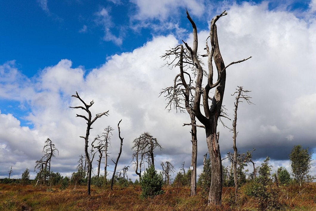 Ein paar Bohlenwegwindungen weiter, wartet der nächste Hingucker, der «Noir Flohay», Reste eines Kiefernwaldes, der aus der Ferne wie ein mystisches Gemälde Caspar David Friedrichs anmutet: Eine Ansammlung verkohlter Baumskelette ragt in den Himmel. Beim Näherkommen wird aber deutlich, dass alles weitergeht, auch nach einem Brand. Im Totenwald blüht und grünt es schon wieder.