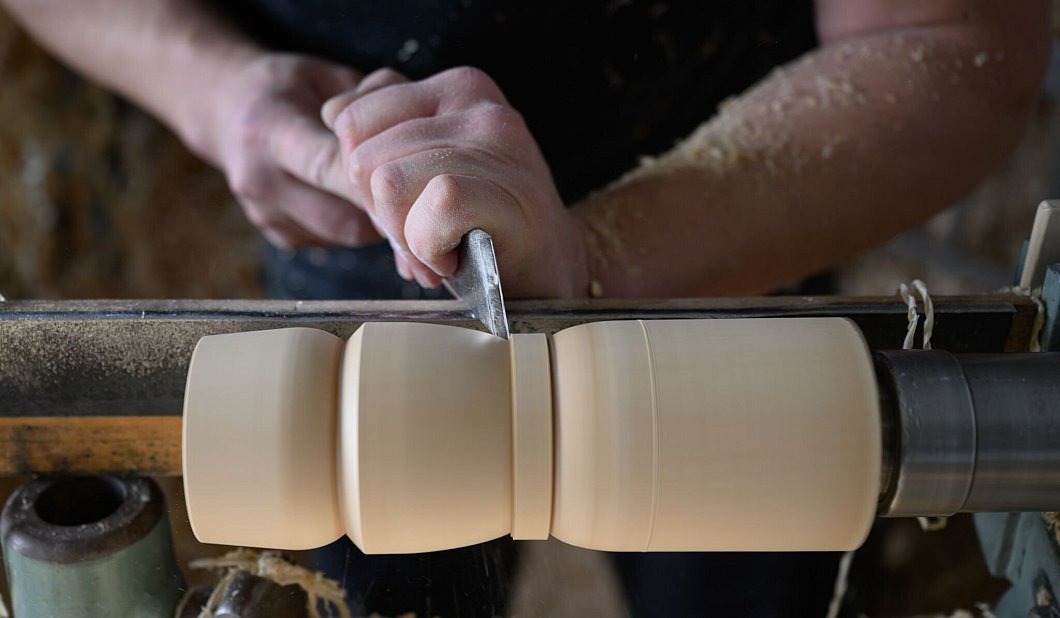 In einem mit Wasserkraft betriebenen Drehwerk aus dem 18. Jahrhundert werden nasse Fichtenholzscheiben per Hand so bearbeitet, dass daraus Tierfiguren entstehen - welche genau, erkennt der Beobachter erst beim Aufspalten des Holzreifens.