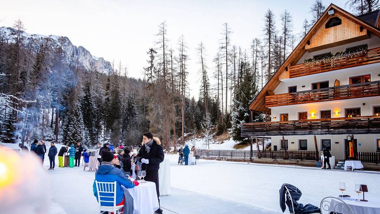 Darauf ein Prost: In der Ferne leuchten die Berge, während sich einige Mutige selbst für ein Tänzchen aufs Eis wagen. | © Manuel Glira/Alta Badia/dpa-tmn