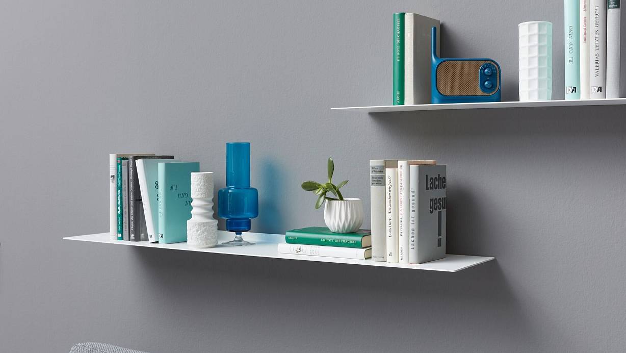 Flache, schwebende Bücherregale, hier von Müller Möbelwerkstätten, sorgen für Leichtigkeit im Raum - darüber kann man Bilder hängen und so die Wand dekorieren. | © Müller Möbelwerkstätten/VDM/dpa-tmn
