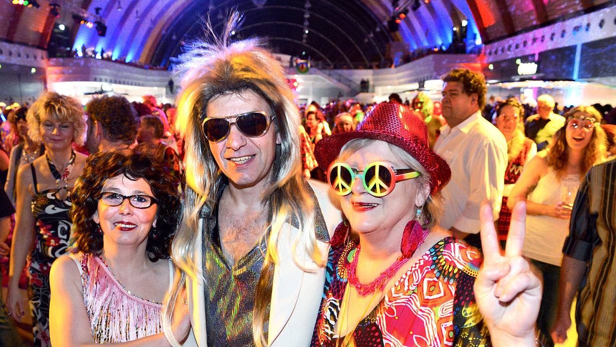 Wer es tragen kann: Gabi, Mario und Hilla, v. l., feiern im Stadthallenanbau die 70er-Jahre-Party „Disco Dome“. Mehr als 1.000, oft schrill verkleidete Partygäste lassen die Halle brodeln. | © FOTOS: BARBARA FRANKE