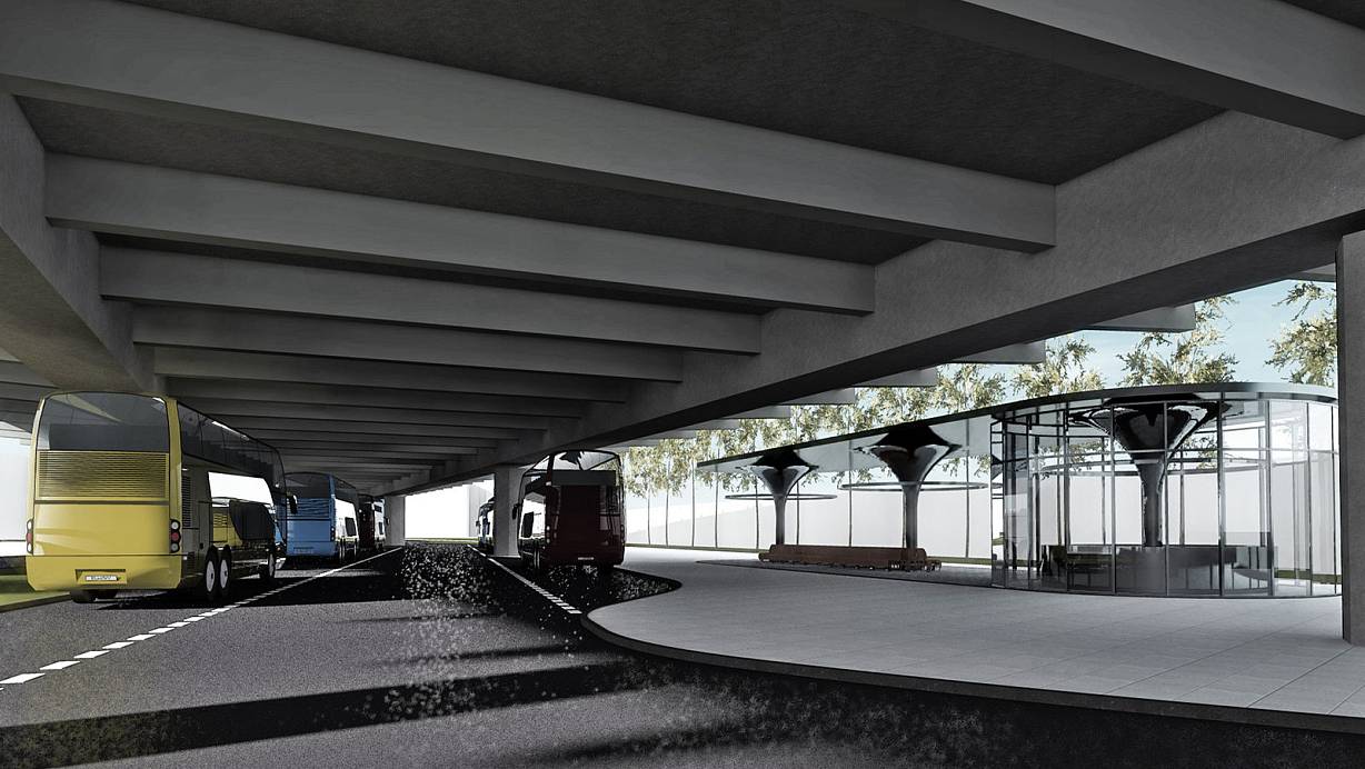 So könnte es aussehen: Die Fernbusse fahren unter dem Ostwestfalendamm an und ab, rechts ein geschützter Wartebereich für die Reisenden. Die Mindener Straße würde rechts daran vorbeigeführt werden. | © Animation: Joachim Oehme + Partner