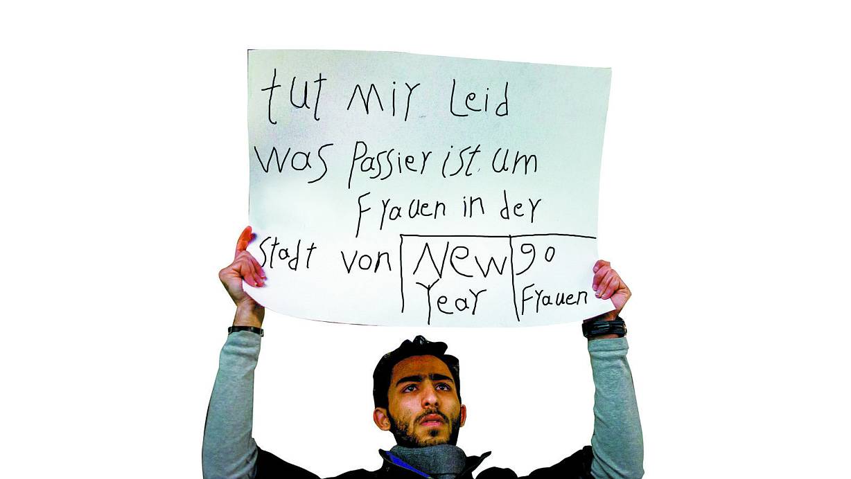 Ein Mann aus Syrien mit einem Plakat mit der Aufschrift «tut mir leid was passier ist um Köln Frauen in der Stadt von New Year» steht am 06.01.2016 in Köln (Nordrhein-Westfalen) vor dem Dom in der Nähe des Hauptbahnhofes. In der Silvesternacht hatte es rund um den Kölner Hauptbahnhof und am Dom zahlreiche sexuelle Übergriffe auf Frauen gegeben. | © picture alliance / dpa