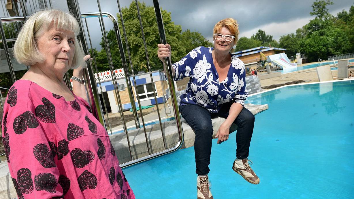 Kampferprobt: Vor allem Hannelore Pfaff (r.), grüne Bezirksbürgermeisterin Gadderbaums, hat mehr als 20 Jahre lang um das Bad gerungen. Vera Höxter kam 2006 dazu. Nun ist alles fertig: das Gebäude verkleinert, das Becken auch. Die Rutsche ist neu. | © Barbara Franke