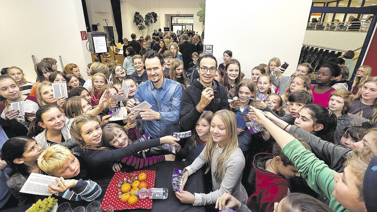 Belagert: Sari (l.) und Eddi von den Wise Guys schreiben Autogramme für die Schüler. Die haben vorher mit der Band für ein Konzert geprobt. | © Wolfgang Rudolf