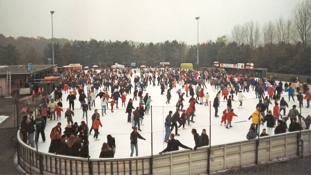 Mit Blick auf den Himmel: Ein Eislauftag in den 1990er Jahren. Erst 1998 kam die Überdachung, zugleich zusätzlicher Raum für die Umkleide. | © Stadtwerke