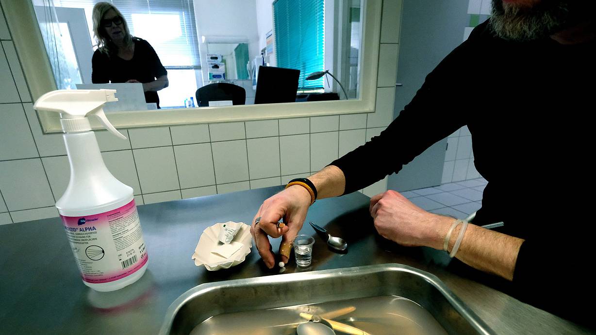 Drogenkonsumraum: Ein Abhängiger setzt sich - in dieser gestellten Szene - im Drogenhilfezentrum an der Borsigstraße einen Schuss in den Handrücken. | © Andreas Frücht