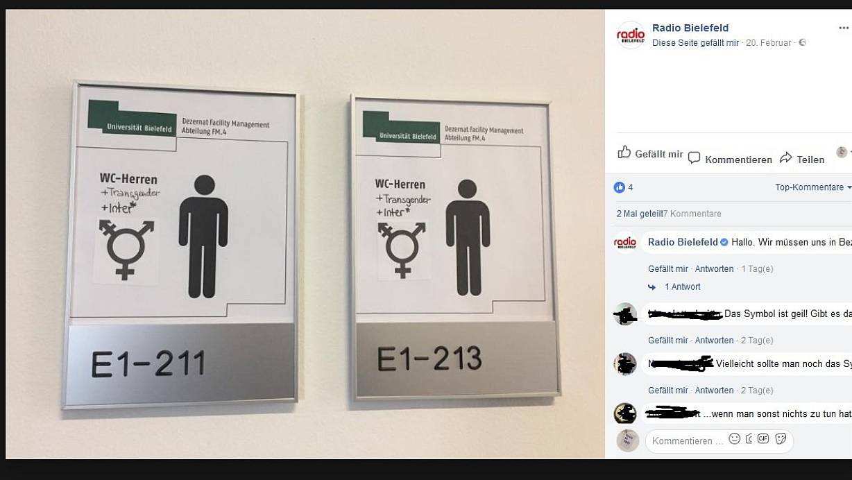 Im Sommersemester 2018 ist es soweit: An der Uni Bielefeld soll es vier "All-Gender-Toiletten" geben. Jetzt machen erste Fotos die Runde, die die neuen Schilder zeigen. Doch dabei handele es sich nicht um die Original-Schilder, sondern um das Kunstwerk eines Unbekannten. Ins Leben gerufen hat die Idee der Allgemeine Studierendenausschluss (Asta), der das Vorhaben im Januar bereits auf Facebook publik gemacht hatte.