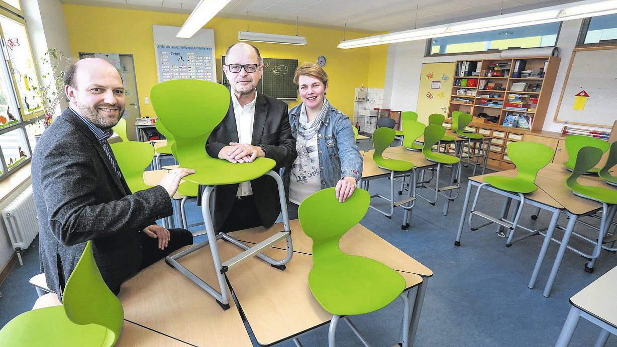 Neue Tische, neue Stühle: Die drei ersten Klassen in Ubbedissen wurden damit ausgestattet. Rote, blaue und - wie hier - grüne Sitzflächen gab's. Schulleiter Martin-Theodor Seifert sowie Frank Jessen und Antje Obermeier (v. l.) vom Förderverein gefällt's. | © Andreas Zobe