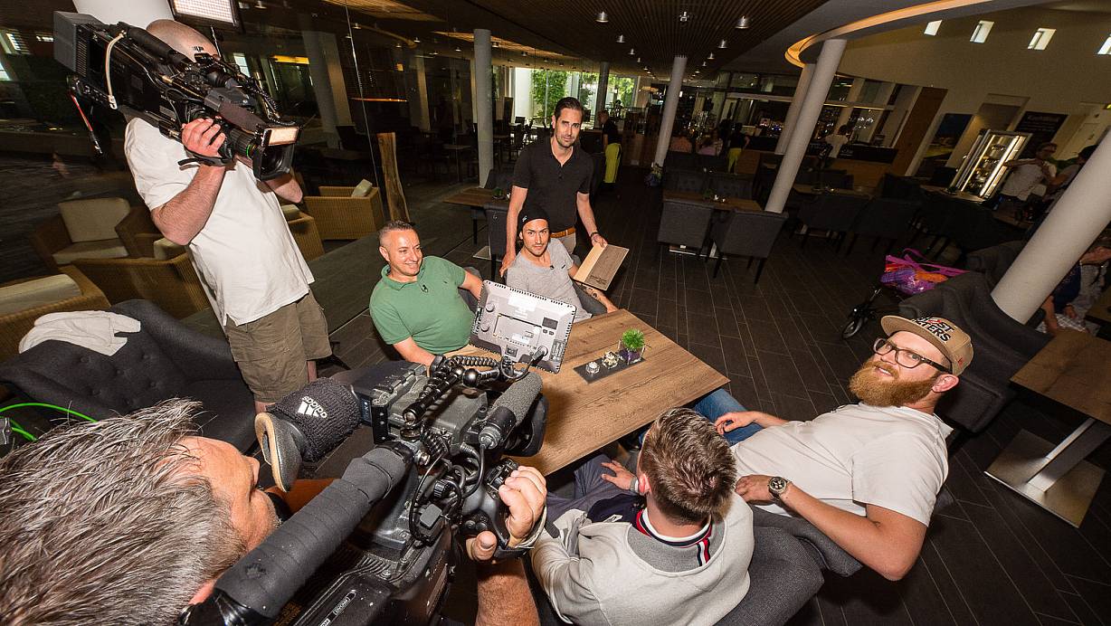 Entspannt: Ehab Tanos (dritter von links) mit seinen Mitbewerbern und dem Kamera-Team von Kabel Eins. | © Christian Mathiesen