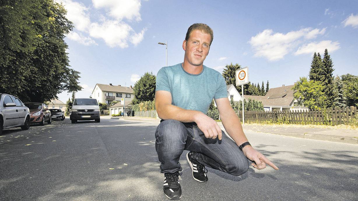 Mitten auf der Brückenstraße: Nils Winkler war der erste Autofahrer, der an der Unfallstelle eintraf. Hier zeigt der Bauklempner, wo der Sechsjährige lag, als er seinen Wagen schützend vor ihn stellte. Kurz darauf machte er sich auf die Suche nach dem Verursacher. | © Oliver Krato