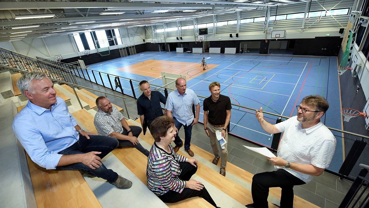 Blick in Dreifachhalle: Mit moderner Technik und elektronischen Anzeigen ist sie ausgestattet. Reinhold Peter (Immobilienservice, r.) begutachtet sie bei einem Rundgang von der Tribüne aus mit Stefan Beckert (Contrata, v.l.), John Engeln, Georgia Schönemann, Andreas Kunert (Amt für Schule), Andreas Schröder und Lars Bleimund. | © Barbara Franke