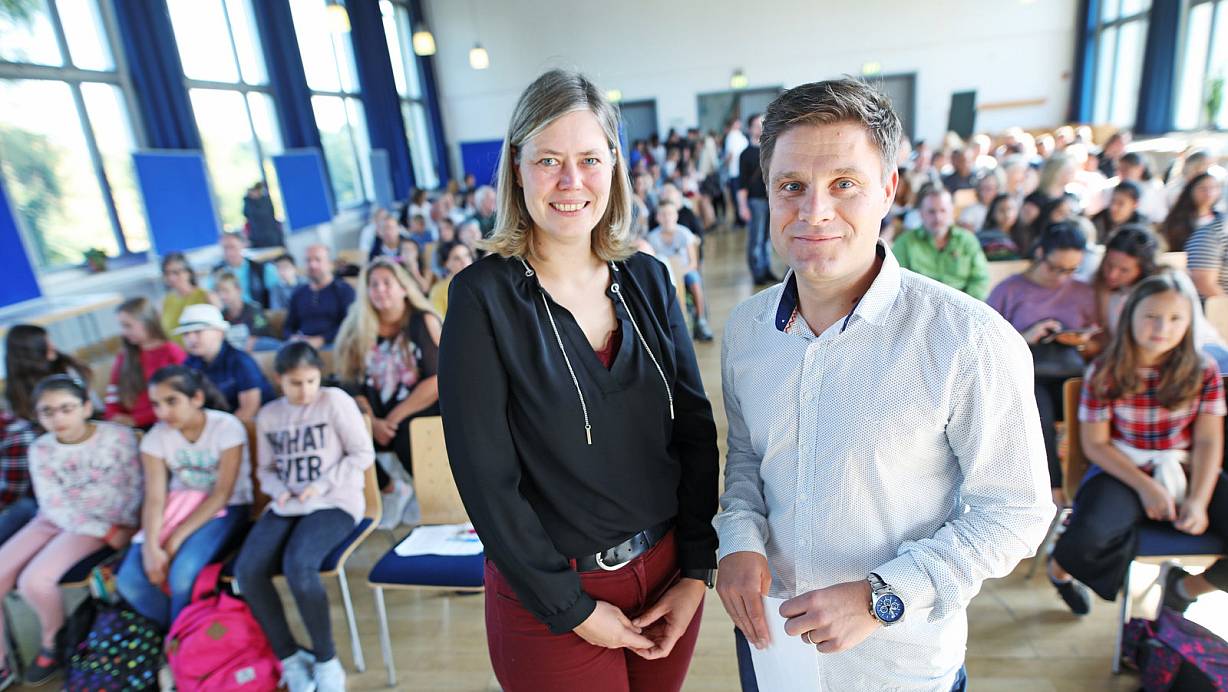 Bauen die neue Sekundarschule Gellershagen auf: Katharina Tweeboom und Stellvertreter Frederik Suchla. Beide kommen von der Gesamtschule Quelle. Bei der Einschulungsfeier wurde es voll - viele Kinder waren mit Eltern und Großeltern gekommen. | © Sarah Jonek