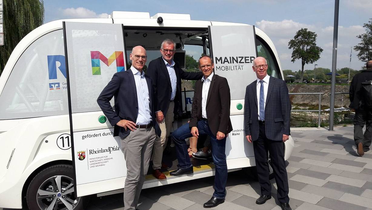 Setzen auf alternative Konzepte: In Mainz haben sich Rainer Müller (l.), ab 2019 Nachfolger von Stadtwerke-Geschäftsführer Friedhelm Rieke (2.v.l.) sowie Geschäftsführer Martin Uekmann über Wasserstoffbusse informiert. Mit dem Leiter der Mainzer Verkehrsbetriebe, Jochen Erlhof (r.), sind sie auch mit einem autonomen Minibus gefahren – alltagstauglich ist das Gefährt noch nicht. | © Sebastian Kaiser