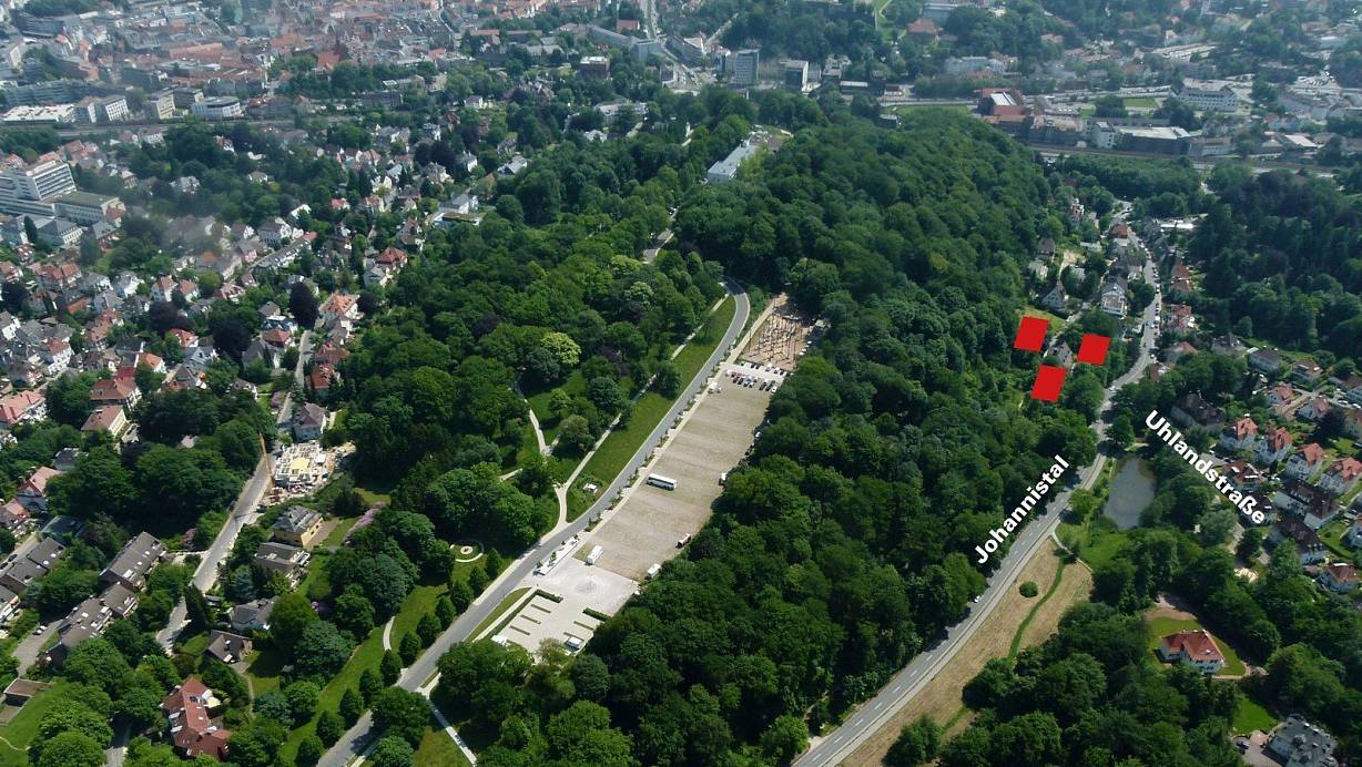 Hier sollen drei Neubauten entstehen: Unterhalb des Kletterparks (Bildmitte, links) auf dem Johannisberg soll oberhalb der Straße Johannistal die Villa mit der Hausnummer 48 abgerissen werden – an ihre Stelle sollen (hier grob eingezeichnet) drei Neubauten kommen. | © Wittig
