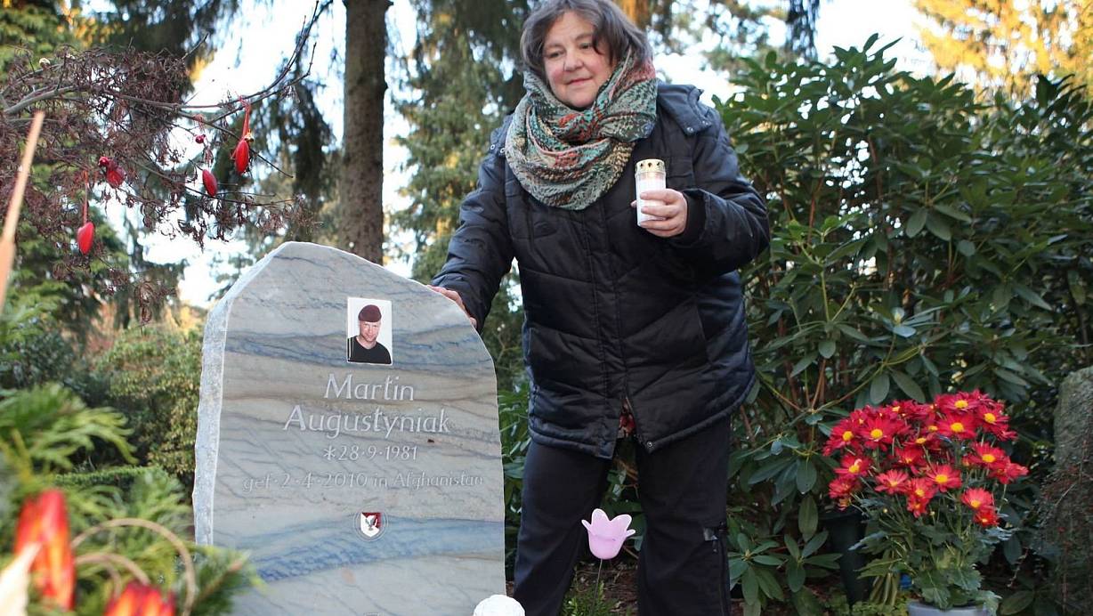 Die Mutter des gefallenen Soldaten Martin Augustyniak, Ursula Wolf, besucht das Ehrengrab ihres Sohnes auf dem Queller Friedhof. | © Oliver Krato